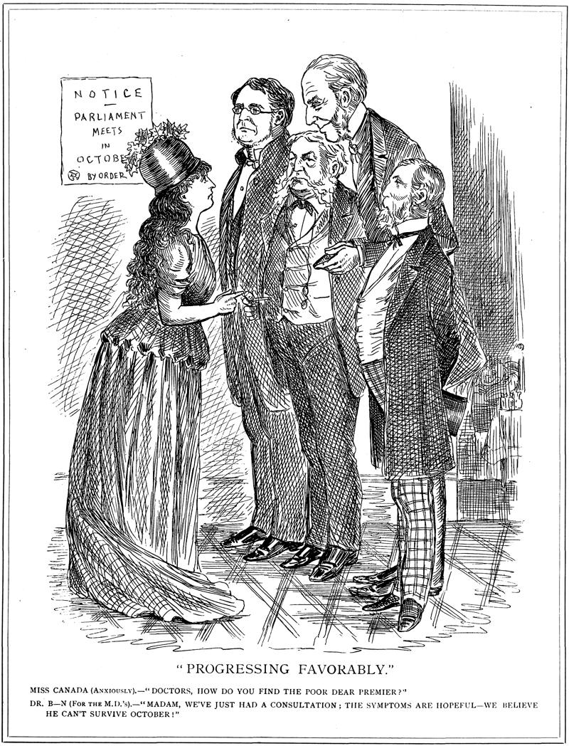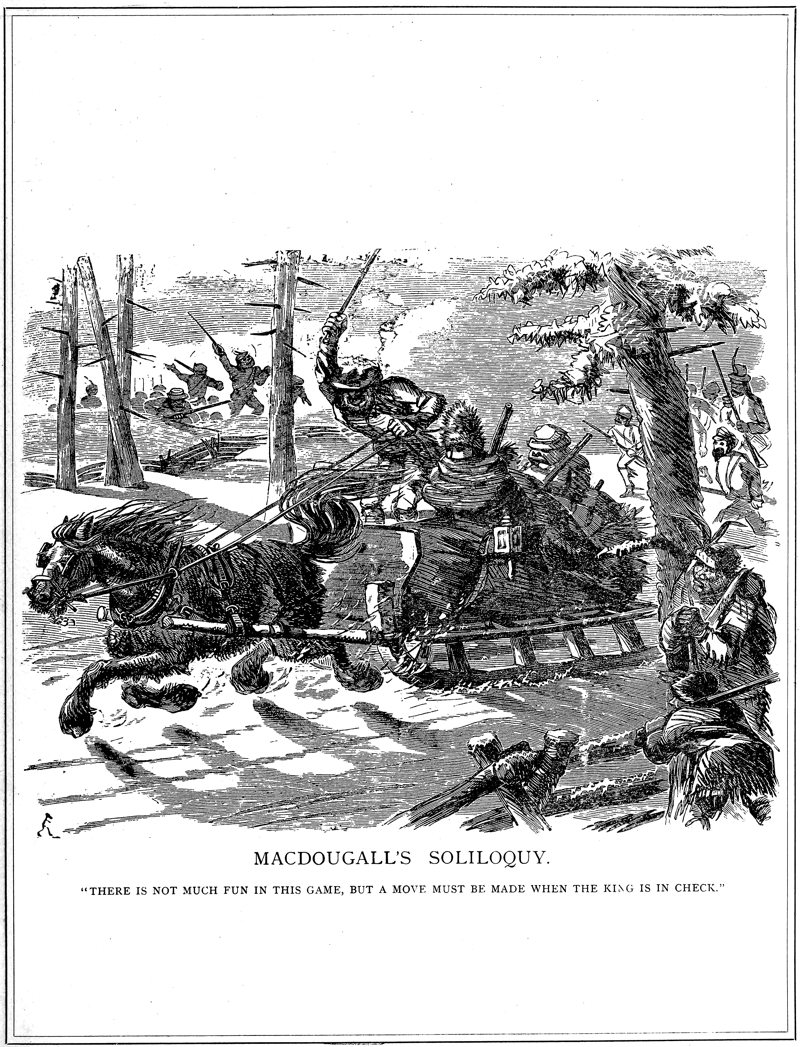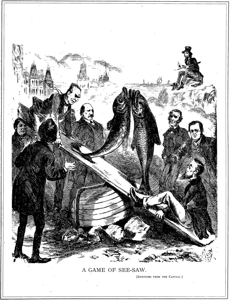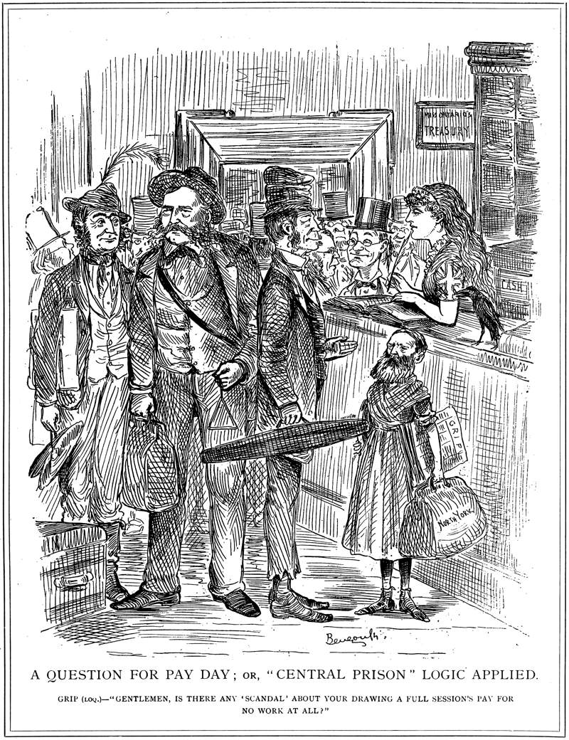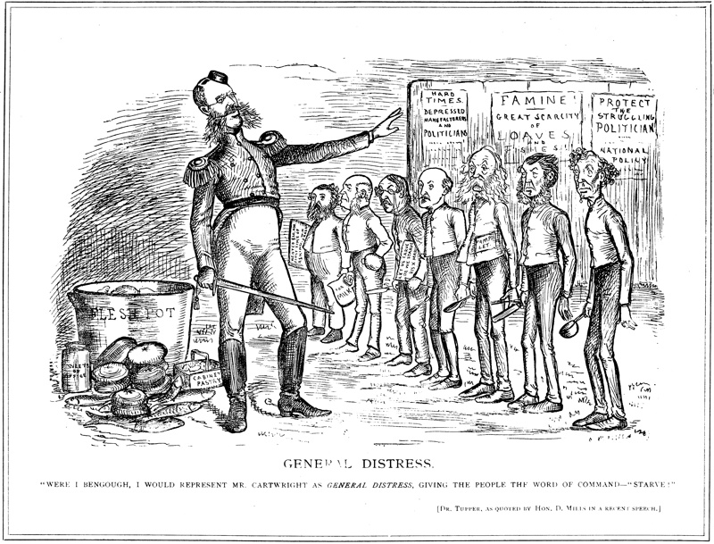 Hon. Dr. Tupper’s suggestion for a cartoon representing the Finance Minister as General Distress giving the people the word of command “Starve!” was of course adopted by Grip’s obliged artist. Certain liberties were, however, taken in interpreting the word “people” which may not exactly have met the honorable gentleman’s idea. It was nevertheless true that the class of our population which at the moment exhibited most signs of starvation was the professional politicians of the Opposition.