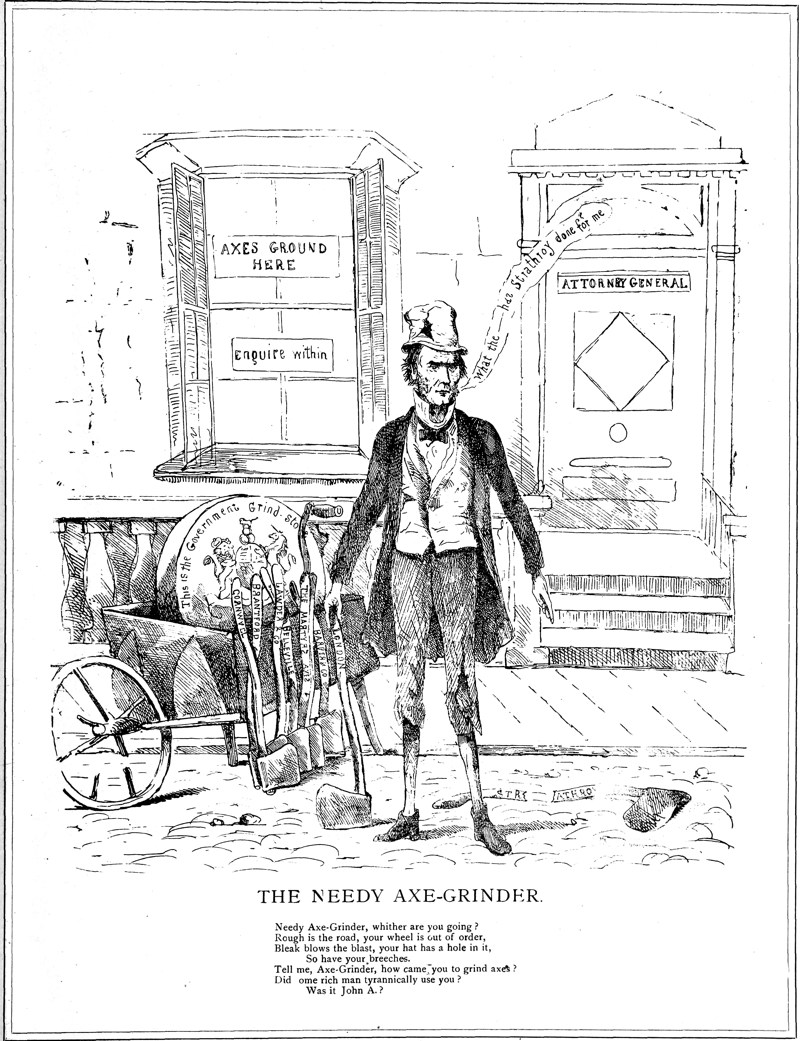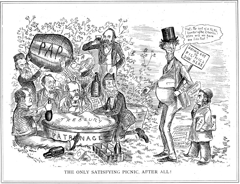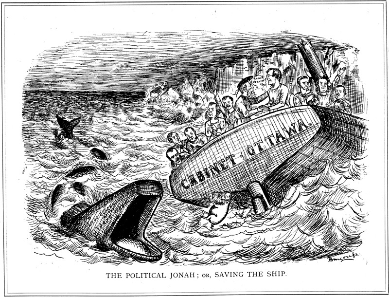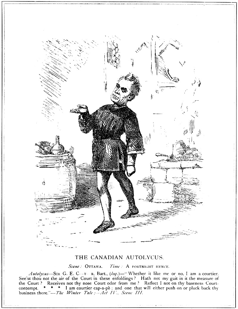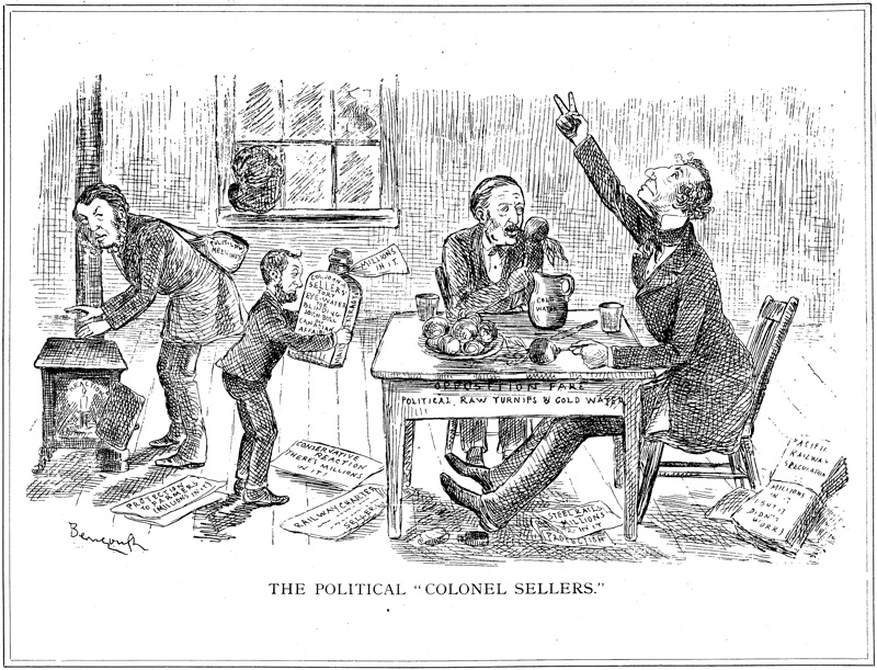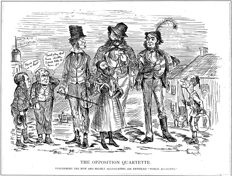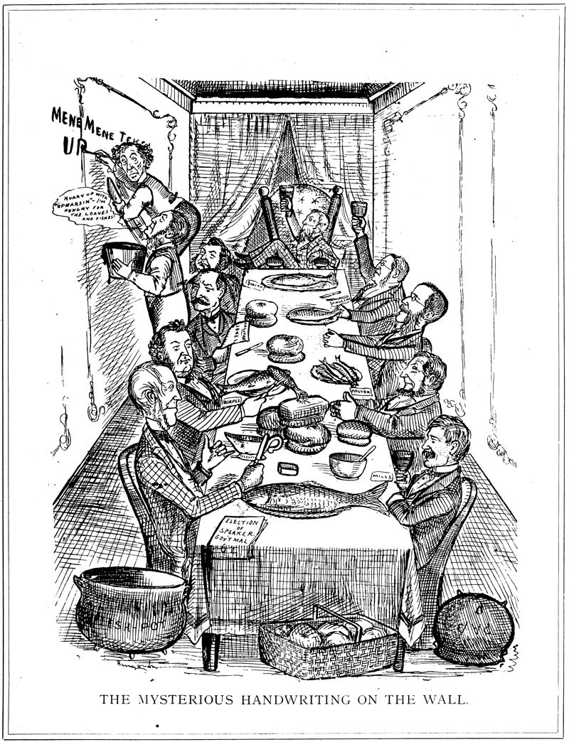 Hon. Dr. Tupper’s suggestion for a cartoon representing the Finance Minister as General Distress giving the people the word of command “Starve!” was of course adopted by Grip’s obliged artist. Certain liberties were, however, taken in interpreting the word “people” which may not exactly have met the honorable gentleman’s idea. It was nevertheless true that the class of our population which at the moment exhibited most signs of starvation was the professional politicians of the Opposition.