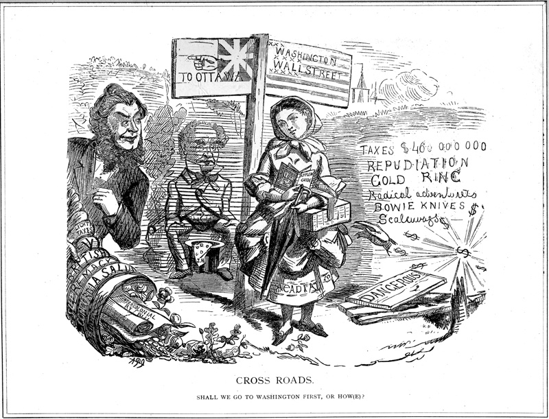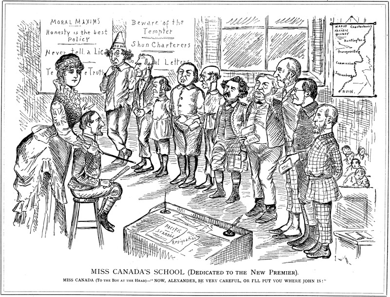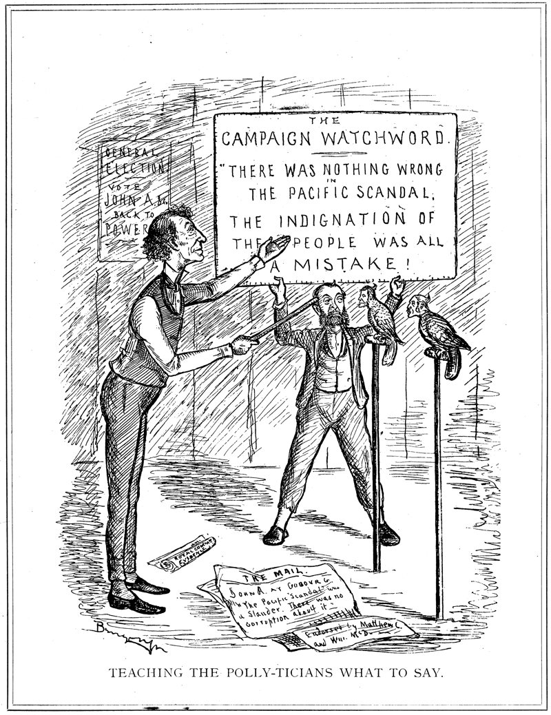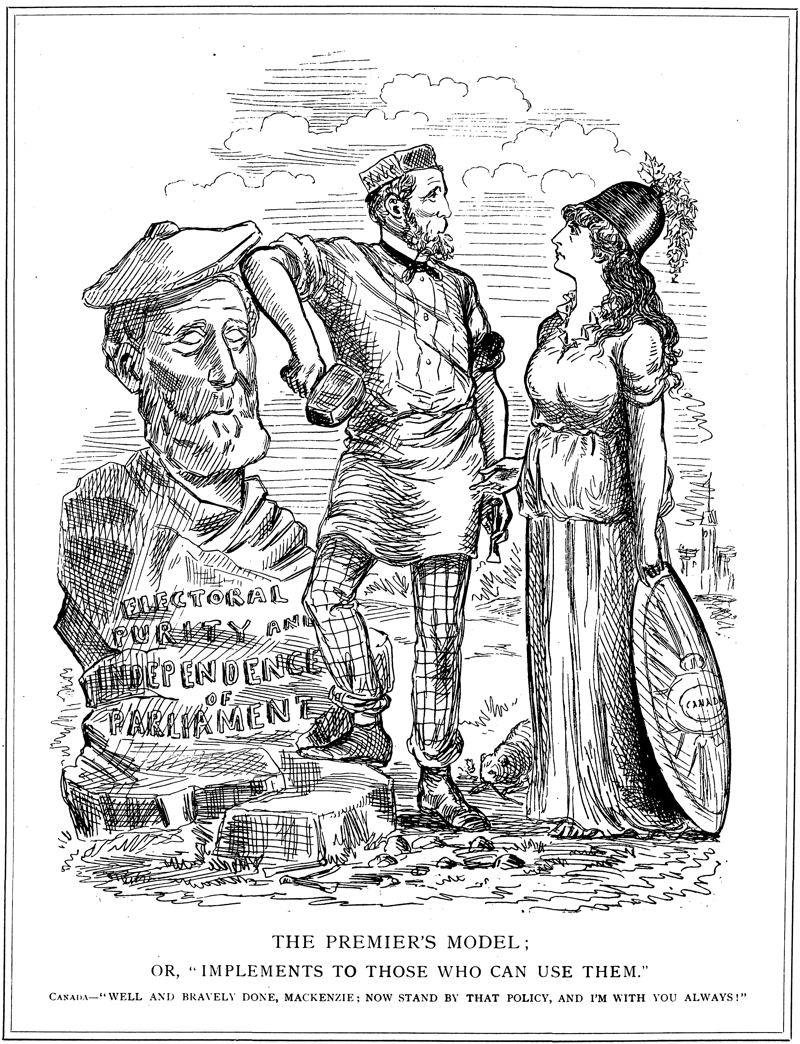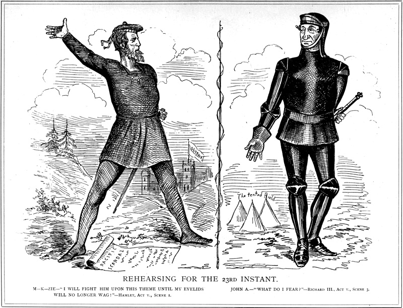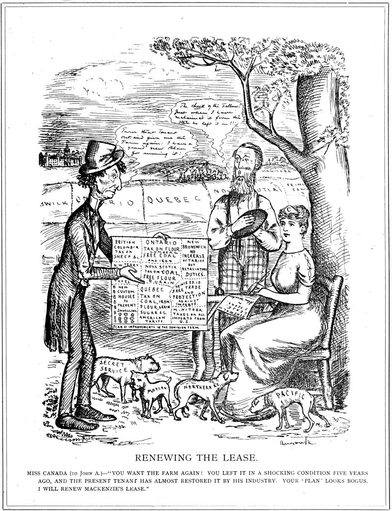 MISS CANADA (to John A.)—“YOU WANT THE FARM AGAIN! YOU LEFT IT IN A SHOCKING CONDITION FIVE YEARS AGO, AND THE PRESENT TENANT HAS ALMOST RESTORED IT BY HIS INDUSTRY. YOUR ‘PLAN’ LOOKS BOGUS. I WILL RENEW MACKENZIE’S LEASE.”