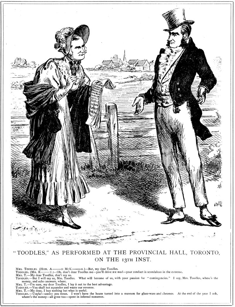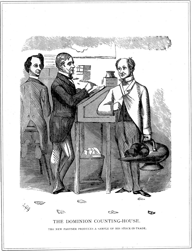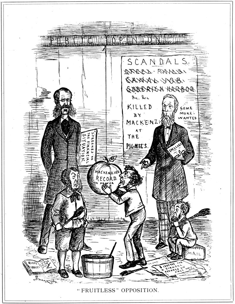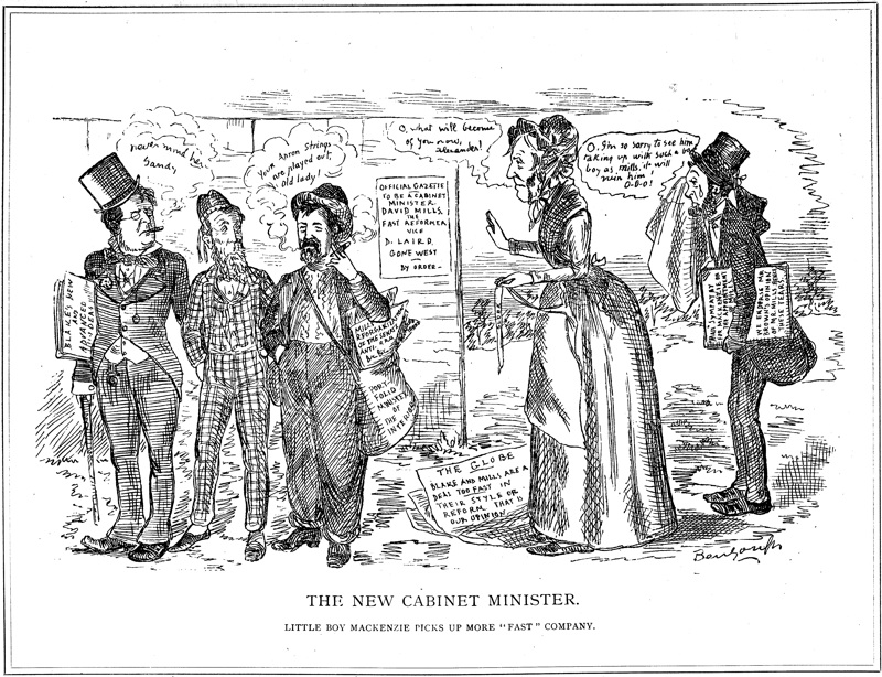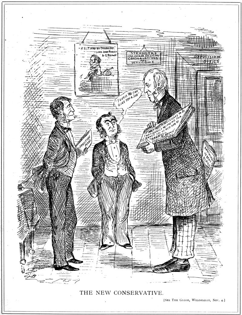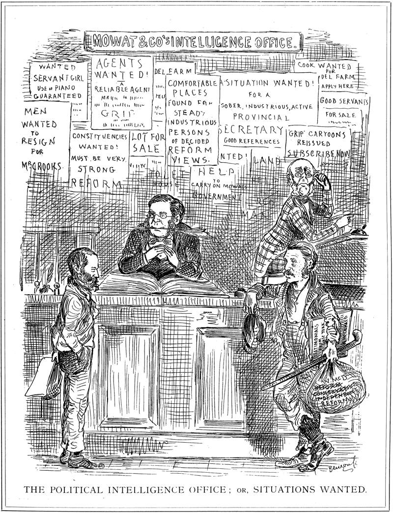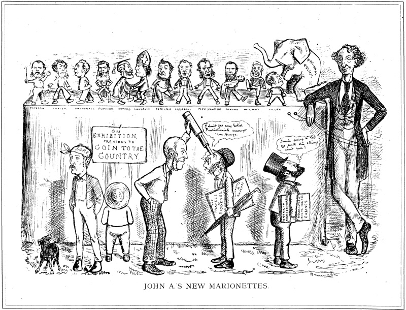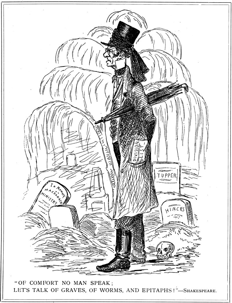 The names of the Members of the new Cabinet were duly announced as given in the cartoon. Mr. Phipps was disappointed in the matter of a portfolio, and still further in the absence from the list of Ministers of the name of any person known to be a sincere Protectionist. It was alleged that Hon. William Macdougall had also entertained hopes of a seat in the Cabinet. The Manufacturers’ Association began to exhibit great activity in view of the forthcoming Tariff changes.