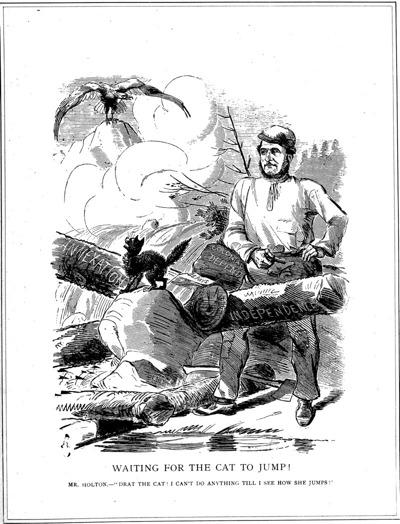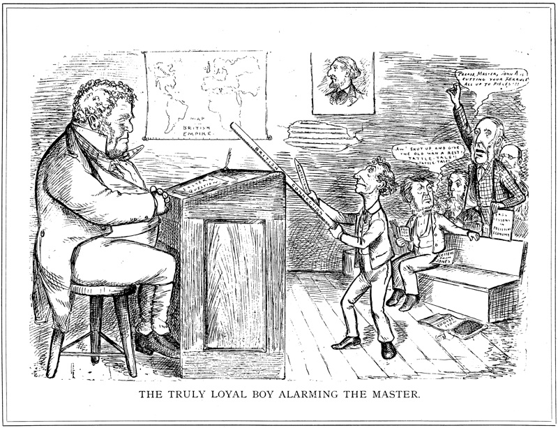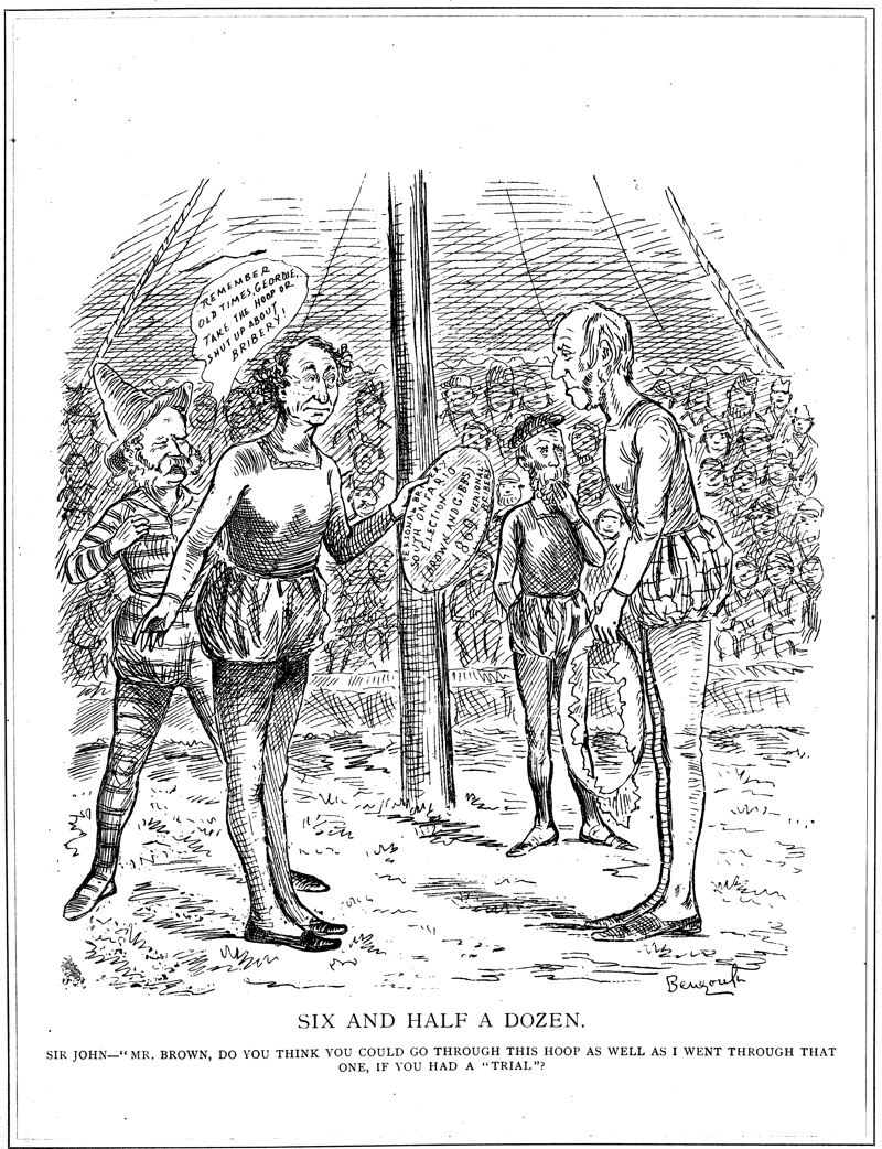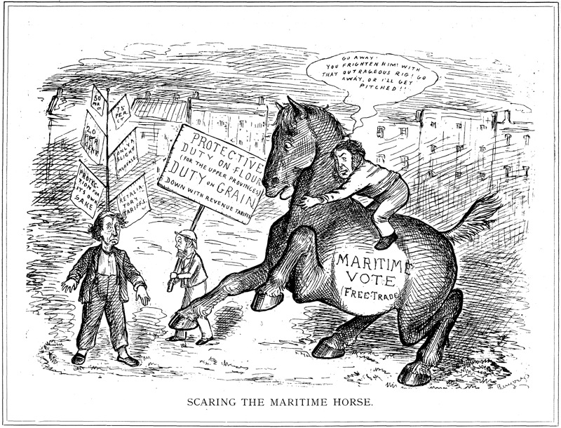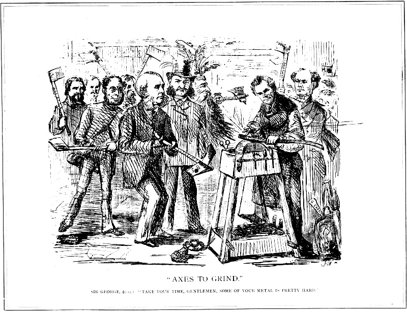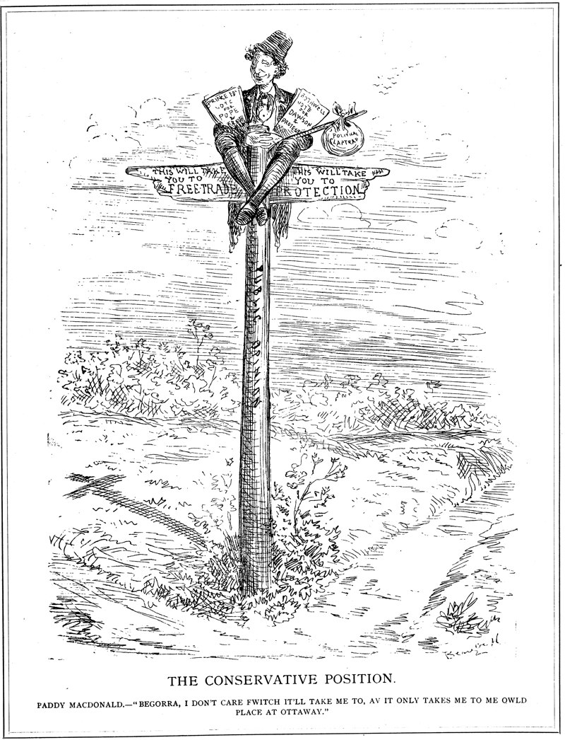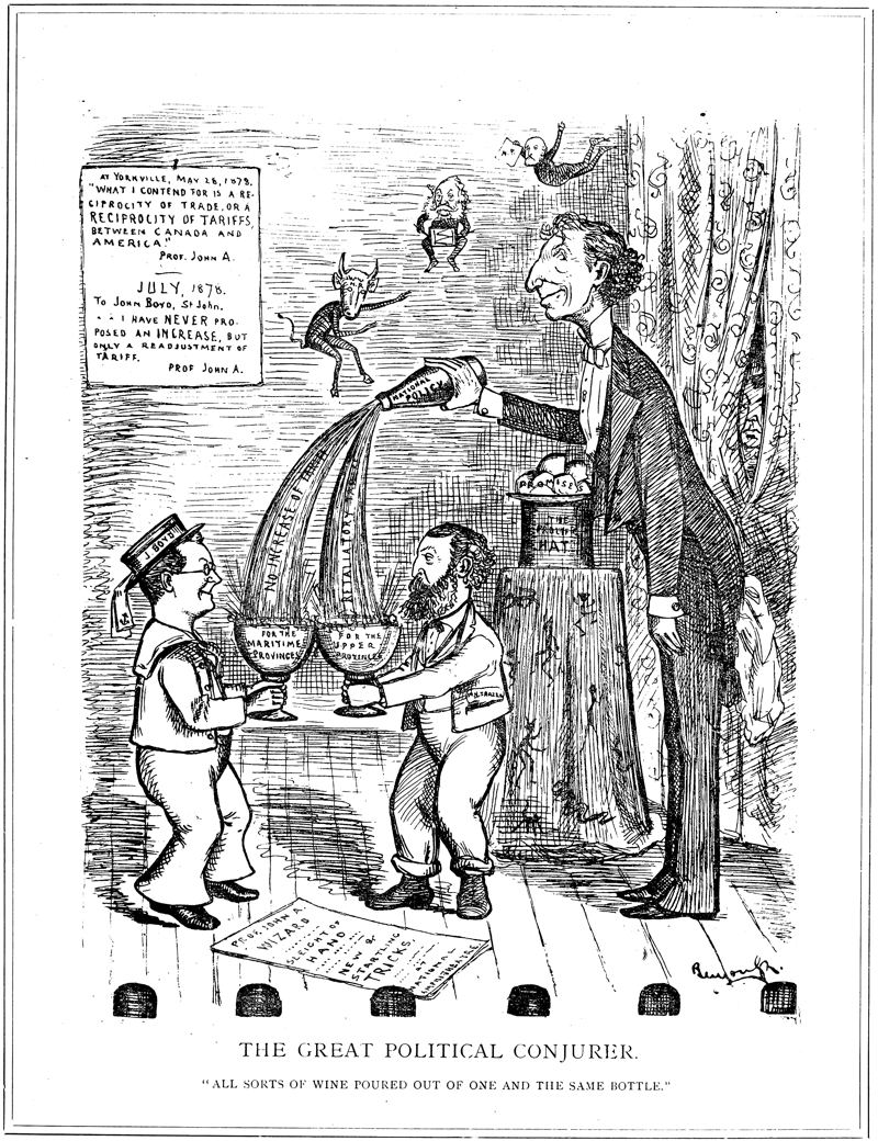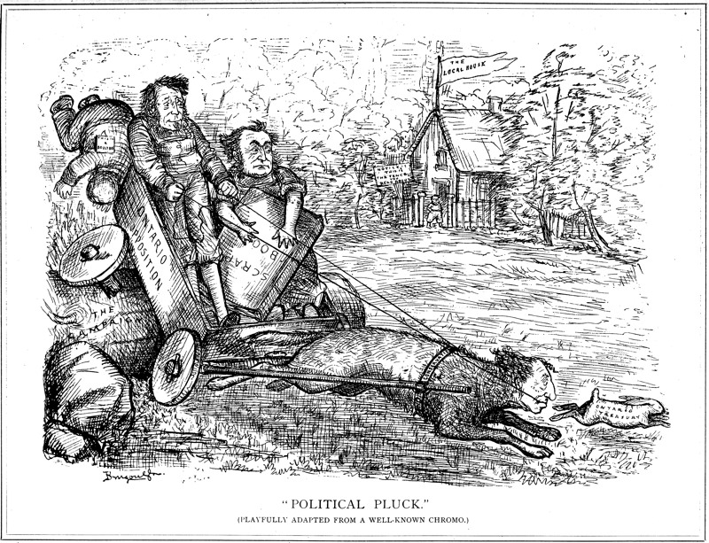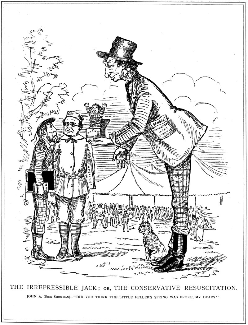 An amusing feature of the campaign was the contradictory nature of the Protectionist utterances. In Ontario Sir John Macdonald declared that if returned to power, he would vigorously protect native industries by shutting out foreign imports. This deliverance created alarm in the Lower Provinces, and in reply to an anxious enquiry from Senator Boyd, of St. John, N. B., upon the subject, the astute leader promptly declared that he had no intention of doing more than readjusting the duties. Mr. W. H. Frazer, who figures in this and some subsequent cartoons, was at the time an active official of the Ontario Manufacturers’ Association, and an ardent Protectionist.