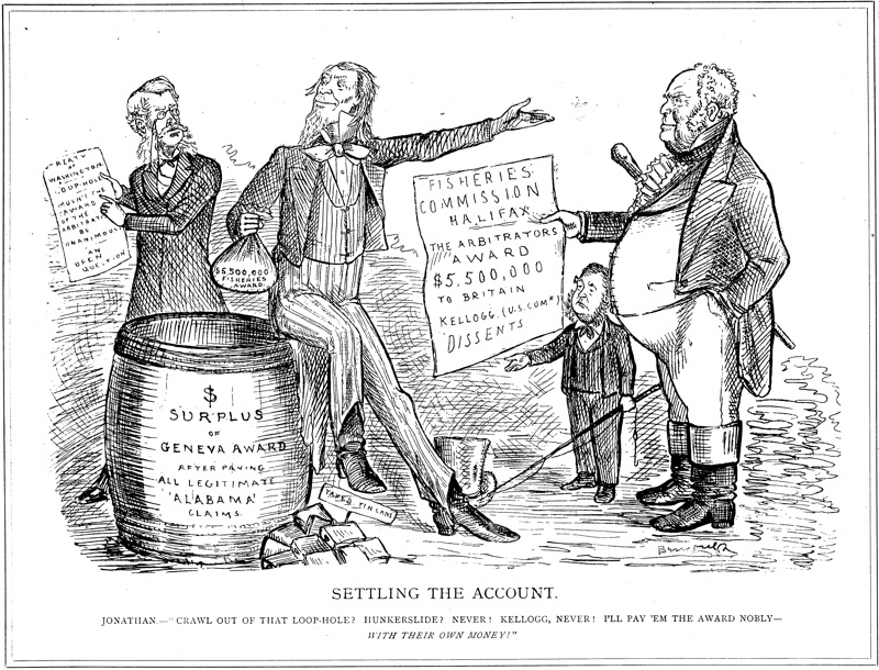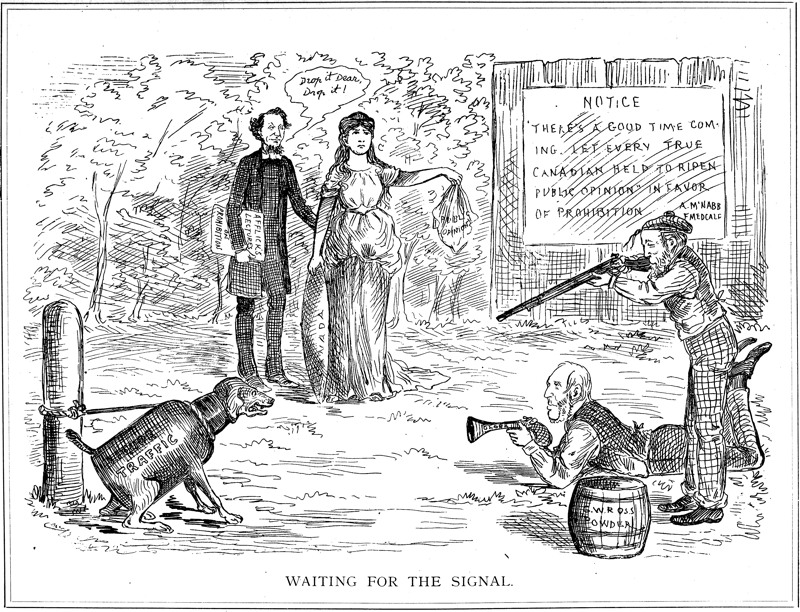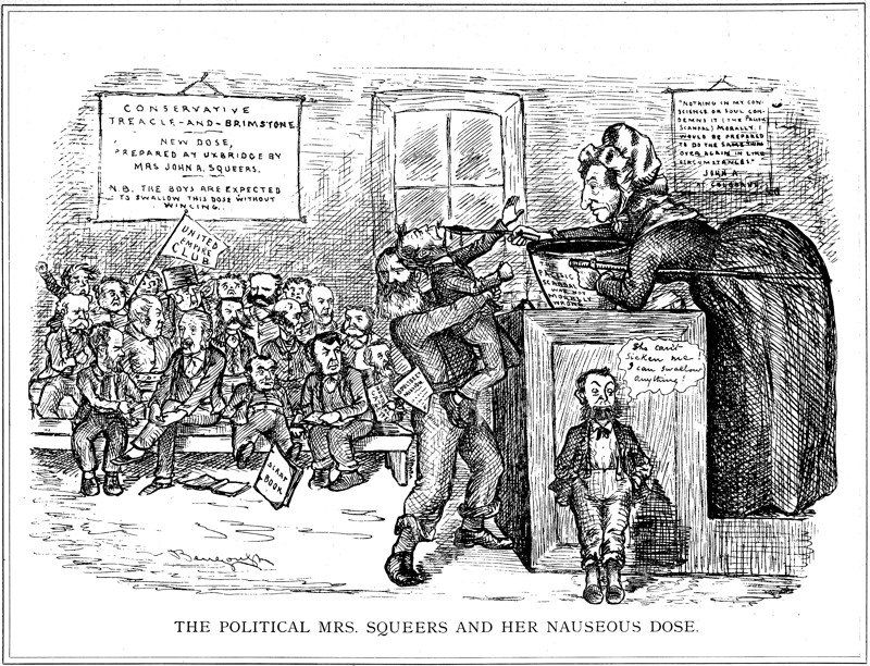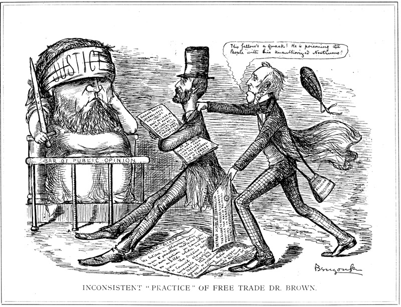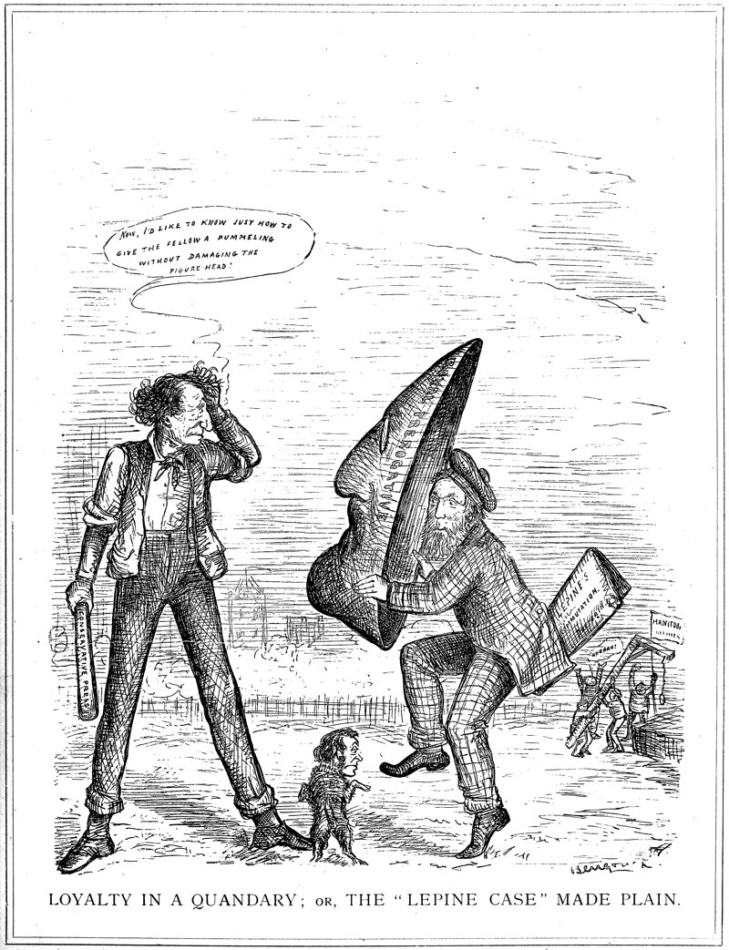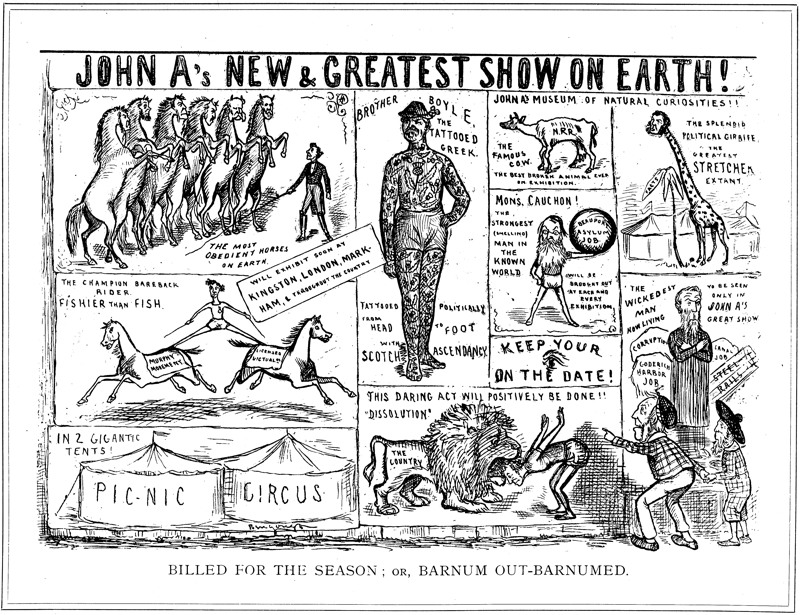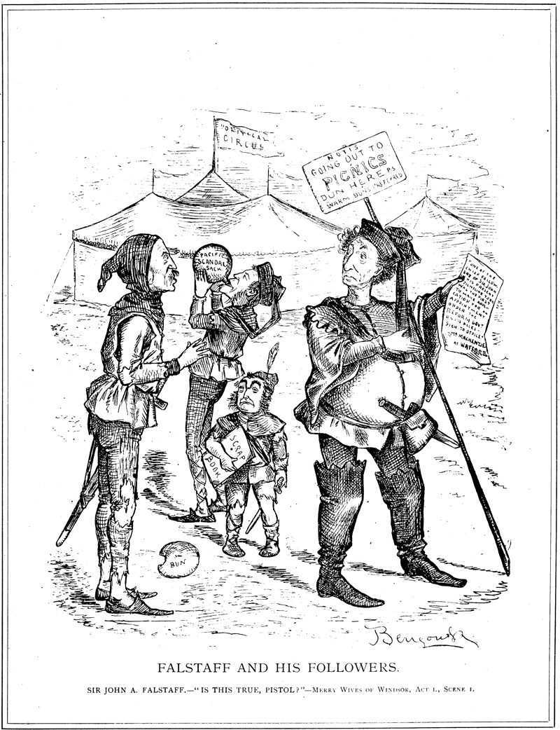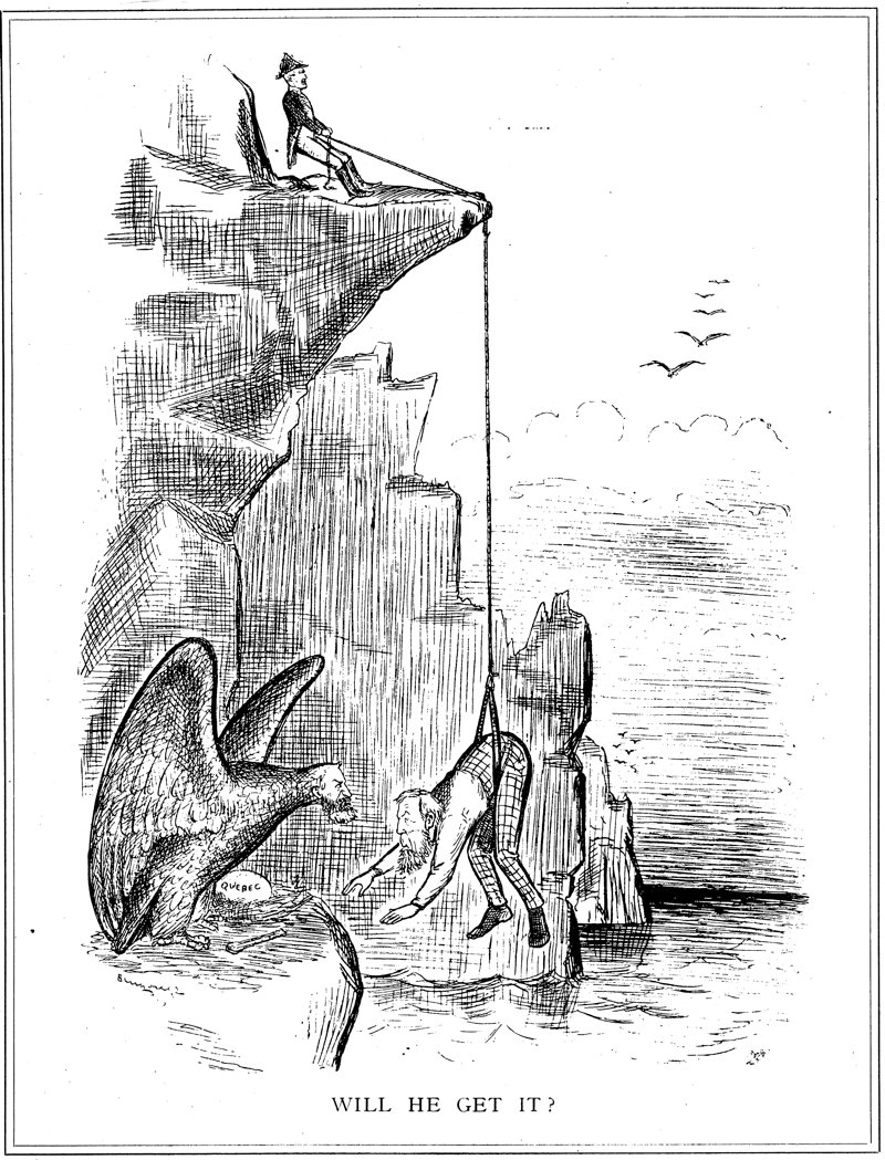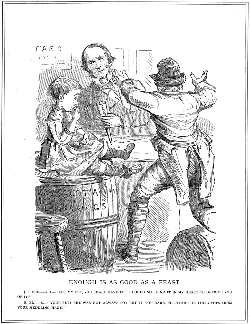 An amusing feature of the campaign was the contradictory nature of the Protectionist utterances. In Ontario Sir John Macdonald declared that if returned to power, he would vigorously protect native industries by shutting out foreign imports. This deliverance created alarm in the Lower Provinces, and in reply to an anxious enquiry from Senator Boyd, of St. John, N. B., upon the subject, the astute leader promptly declared that he had no intention of doing more than readjusting the duties. Mr. W. H. Frazer, who figures in this and some subsequent cartoons, was at the time an active official of the Ontario Manufacturers’ Association, and an ardent Protectionist.