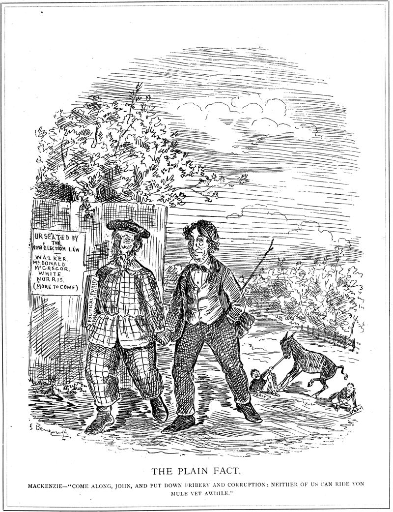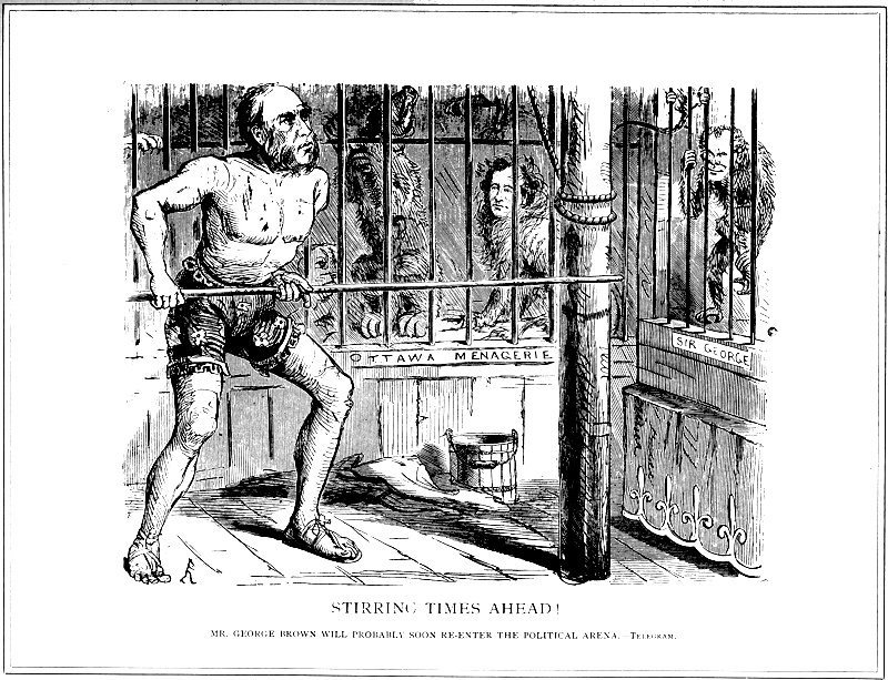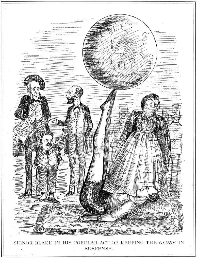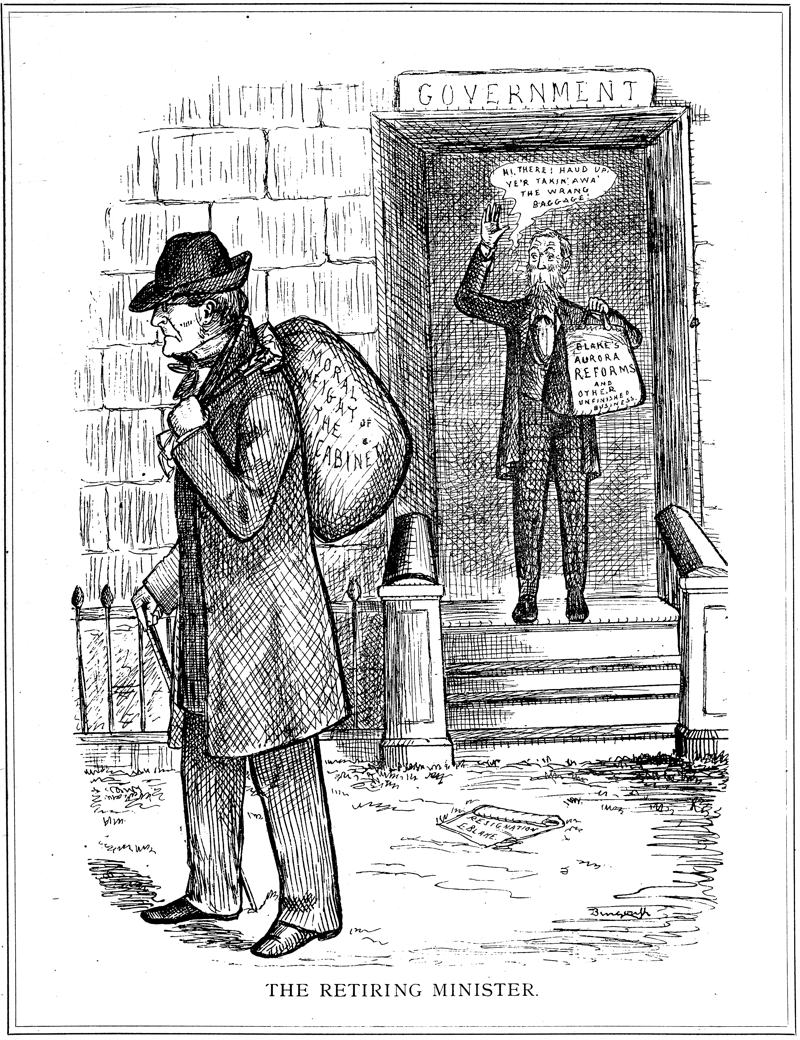 This cartoon is perhaps so obvious as to need no comment. The general feeling in the Reform Party in favor of the retirement of Mr. Mackenzie from the leadership, in favor of Mr. Blake, was not warmly shared by the Globe. When ultimately the change was effected a degree of dissatisfaction was expressed in some quarters where the impression obtained that Mr. Mackenzie had not been generously treated in the matter.