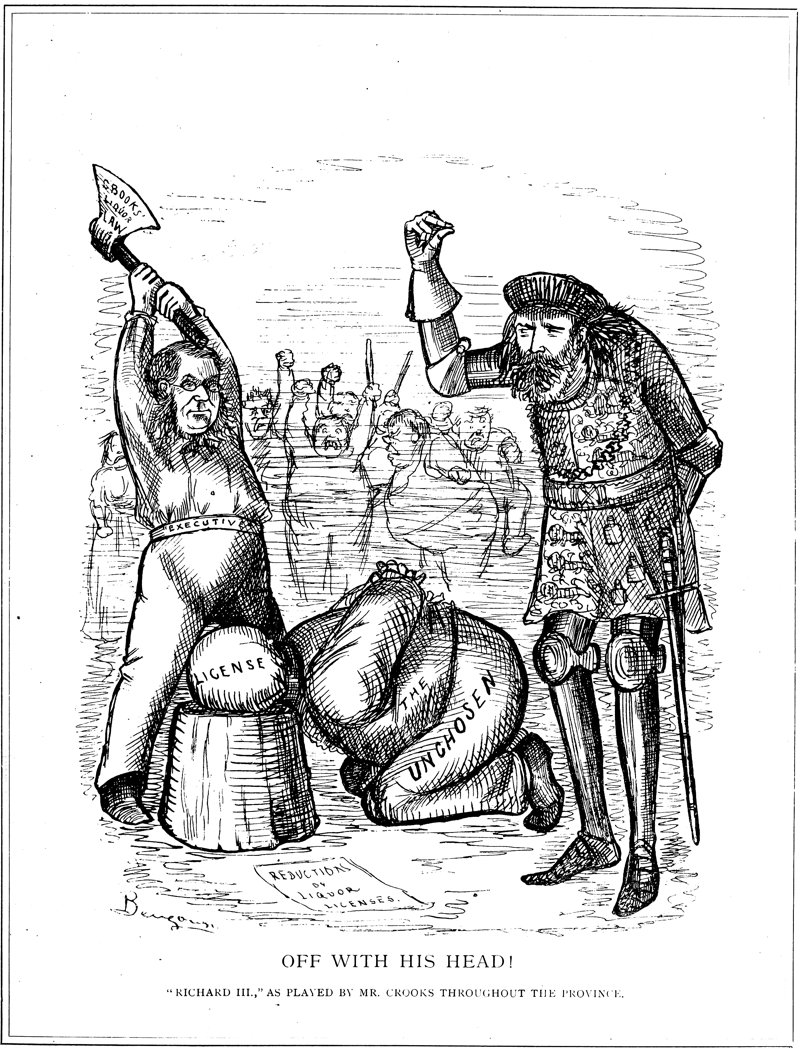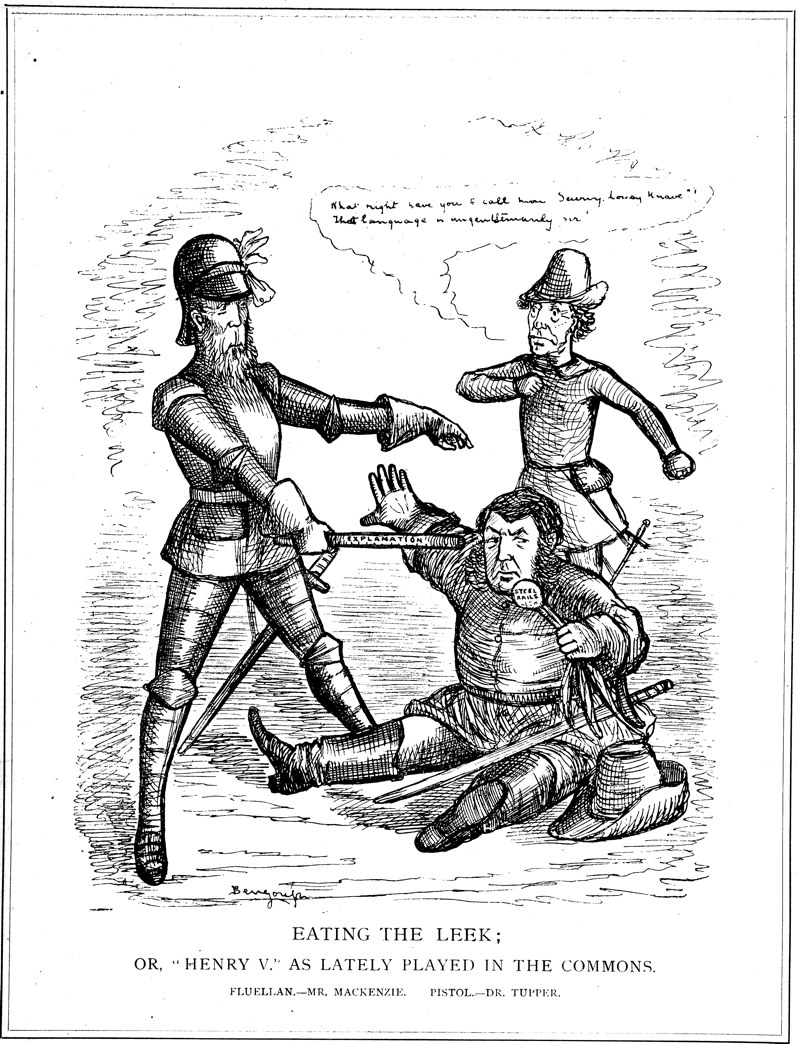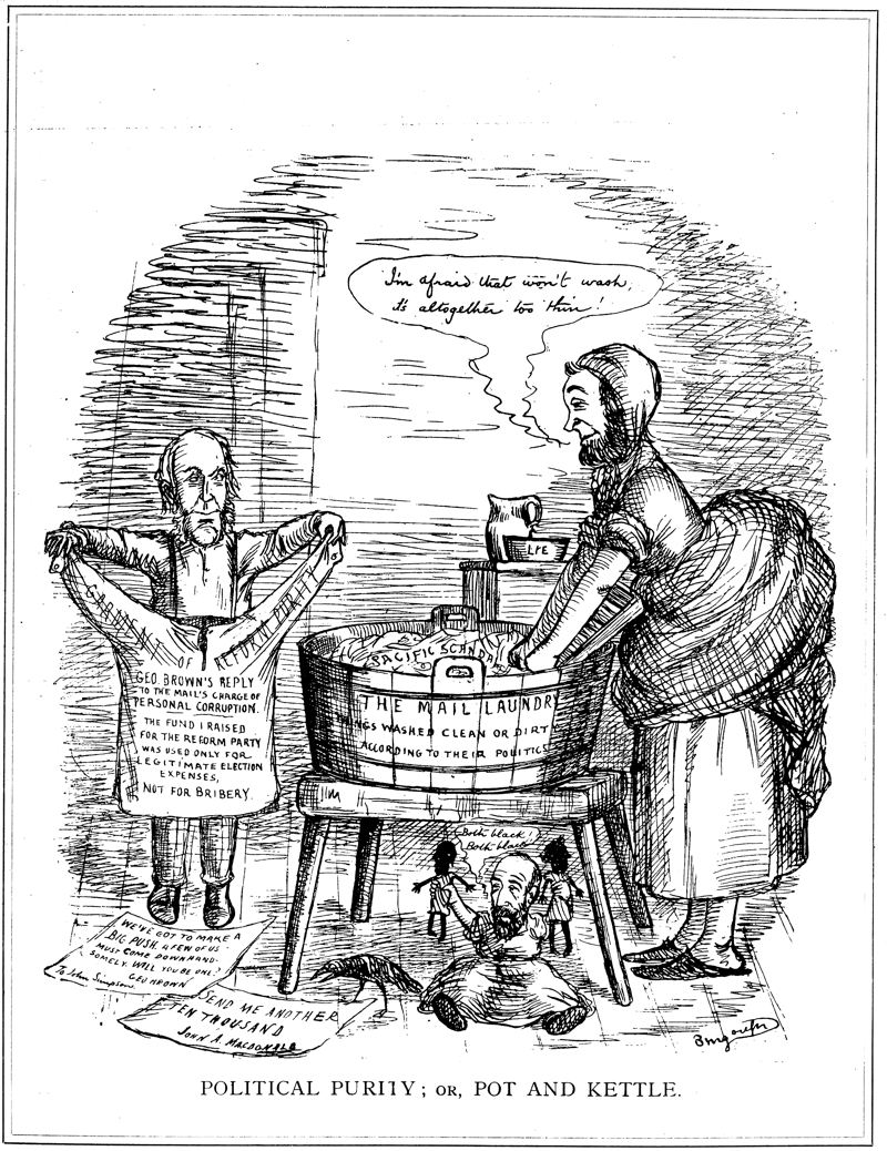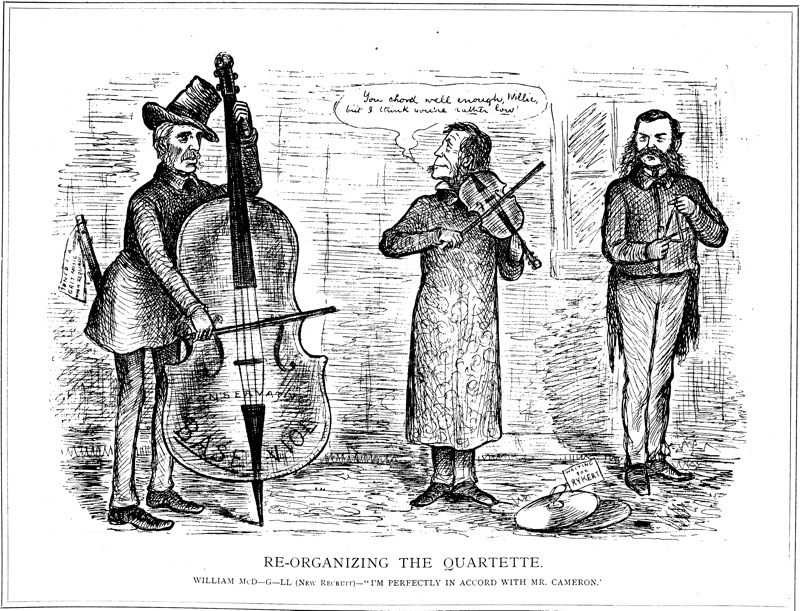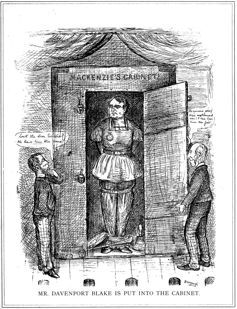 This cartoon is perhaps so obvious as to need no comment. The general feeling in the Reform Party in favor of the retirement of Mr. Mackenzie from the leadership, in favor of Mr. Blake, was not warmly shared by the Globe. When ultimately the change was effected a degree of dissatisfaction was expressed in some quarters where the impression obtained that Mr. Mackenzie had not been generously treated in the matter.