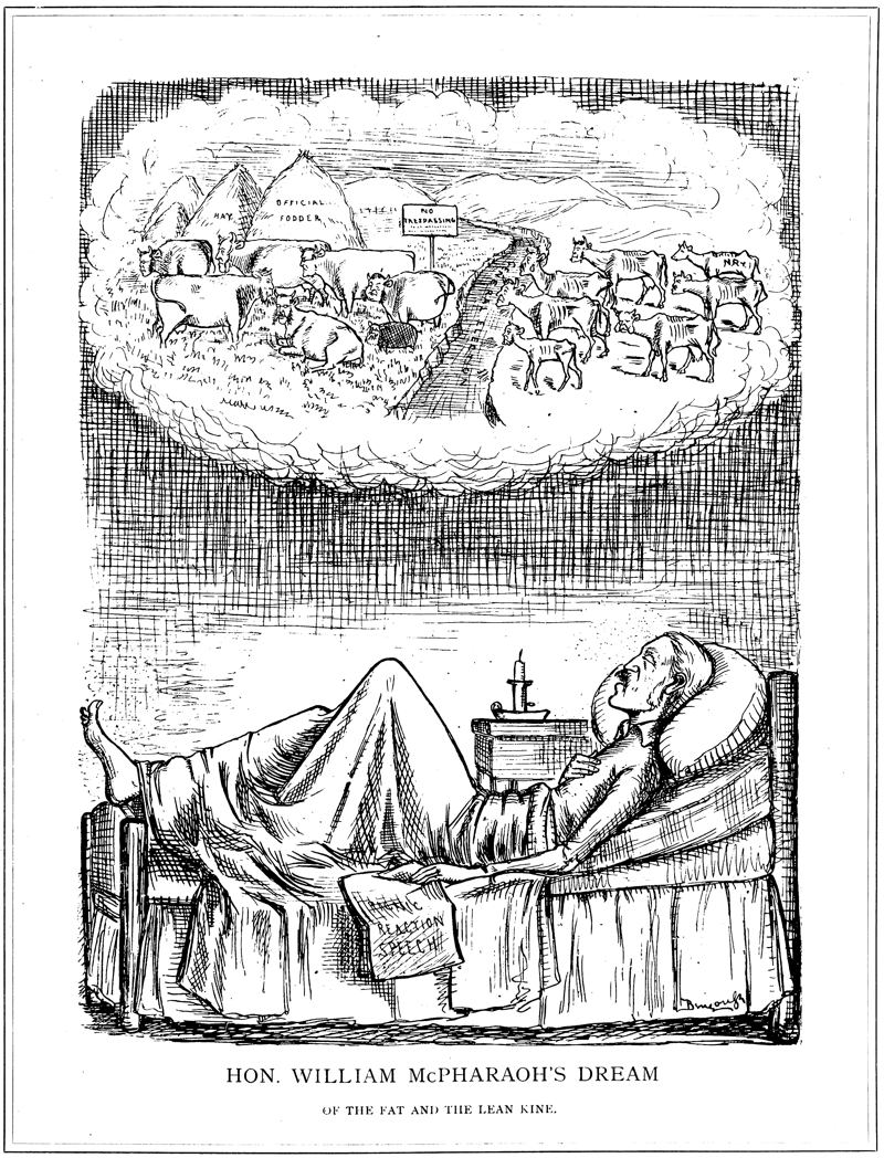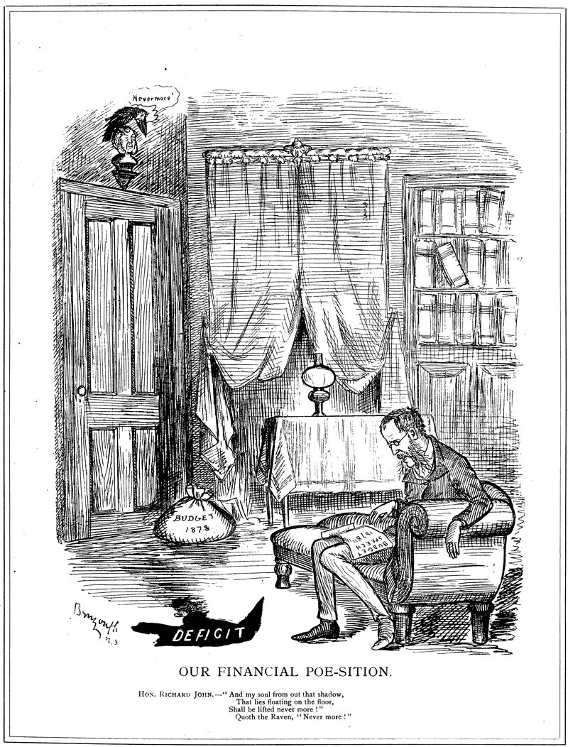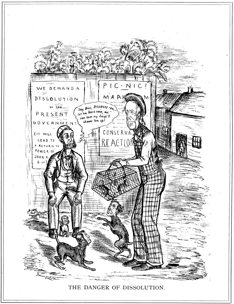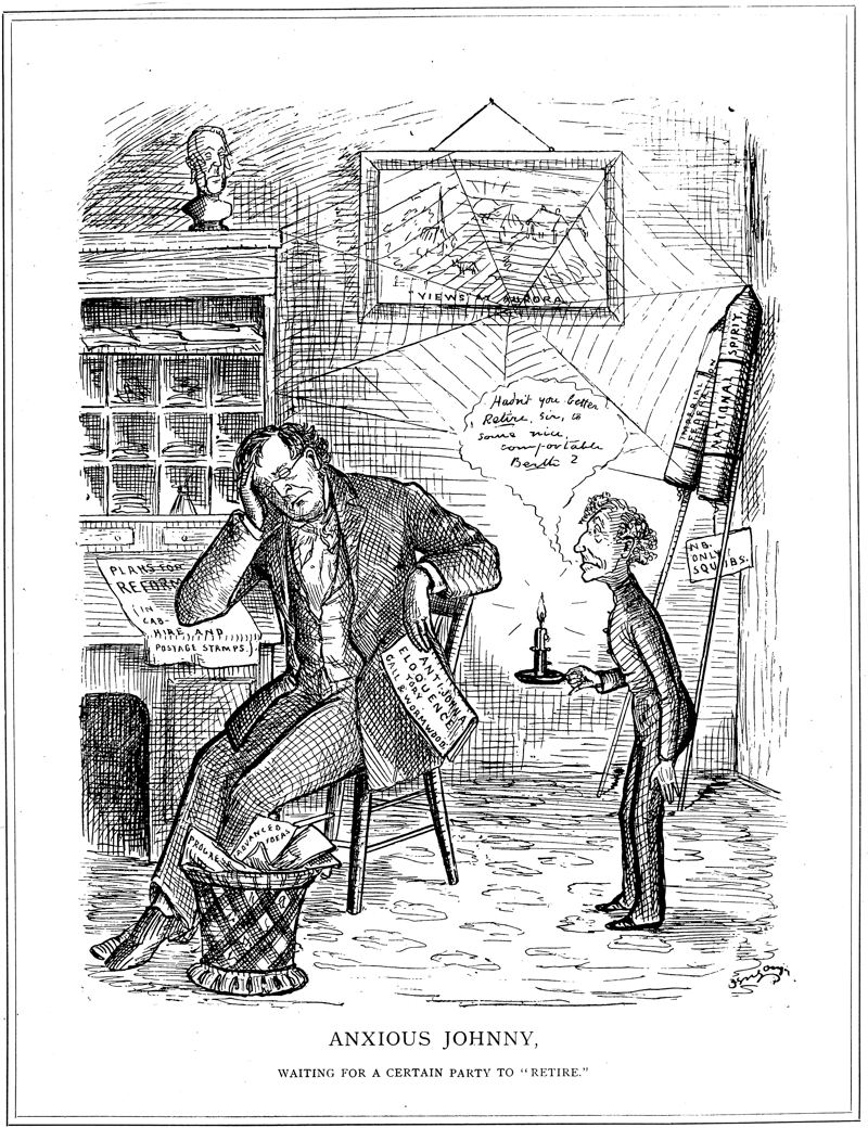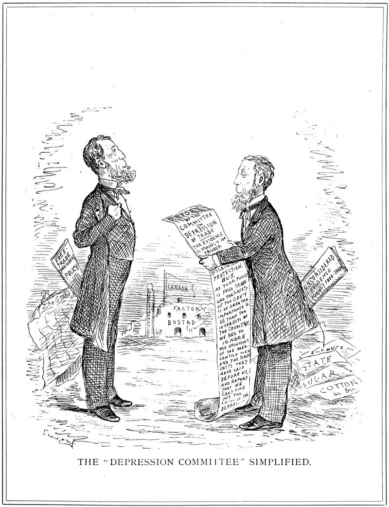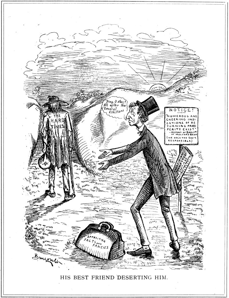 To the hard times Sir John and his Party were primarily indebted for their present good fortune, but (contrary to the hopes of the innocents who had implicitly accepted the anti-election promises of the N. P. advocates) prosperity did not immediately return. The persistency with which the depression continued to “hang on” was a source of much annoyance to the Government, as it was the constant theme of ridicule in the Reform press.