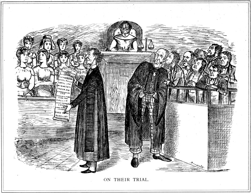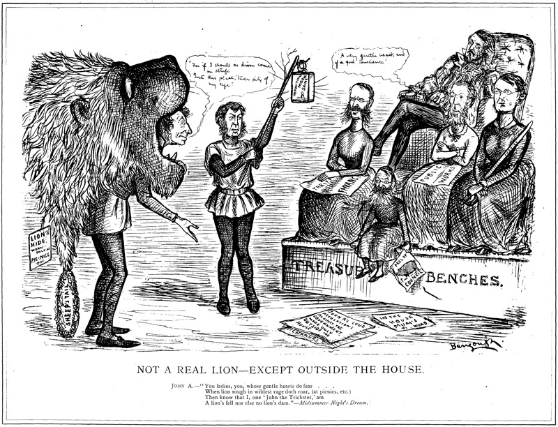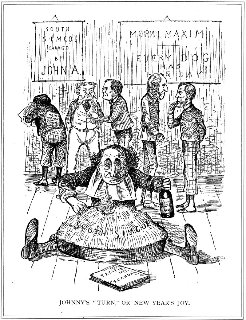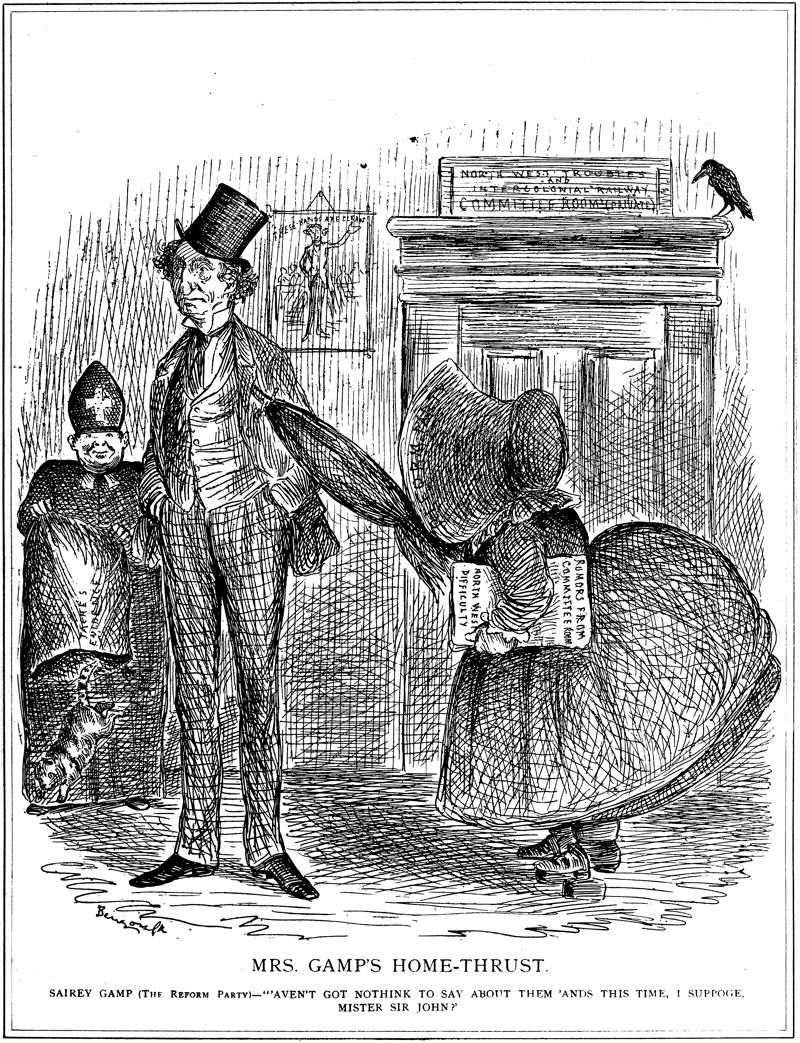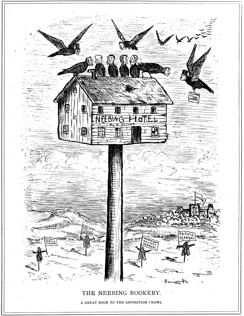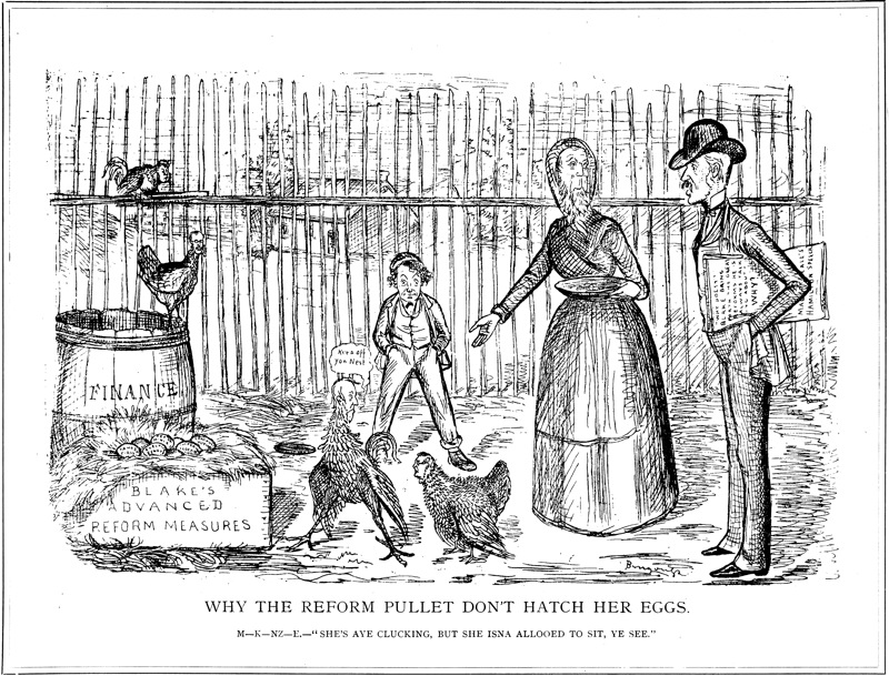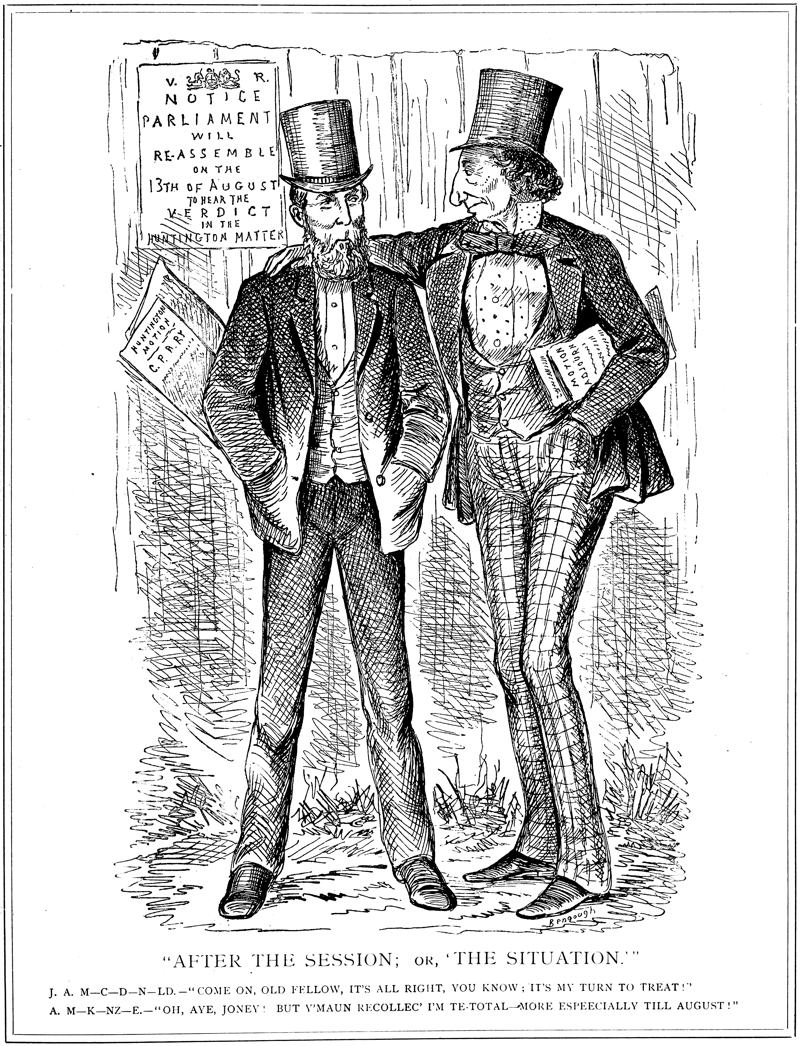 To the hard times Sir John and his Party were primarily indebted for their present good fortune, but (contrary to the hopes of the innocents who had implicitly accepted the anti-election promises of the N. P. advocates) prosperity did not immediately return. The persistency with which the depression continued to “hang on” was a source of much annoyance to the Government, as it was the constant theme of ridicule in the Reform press.
