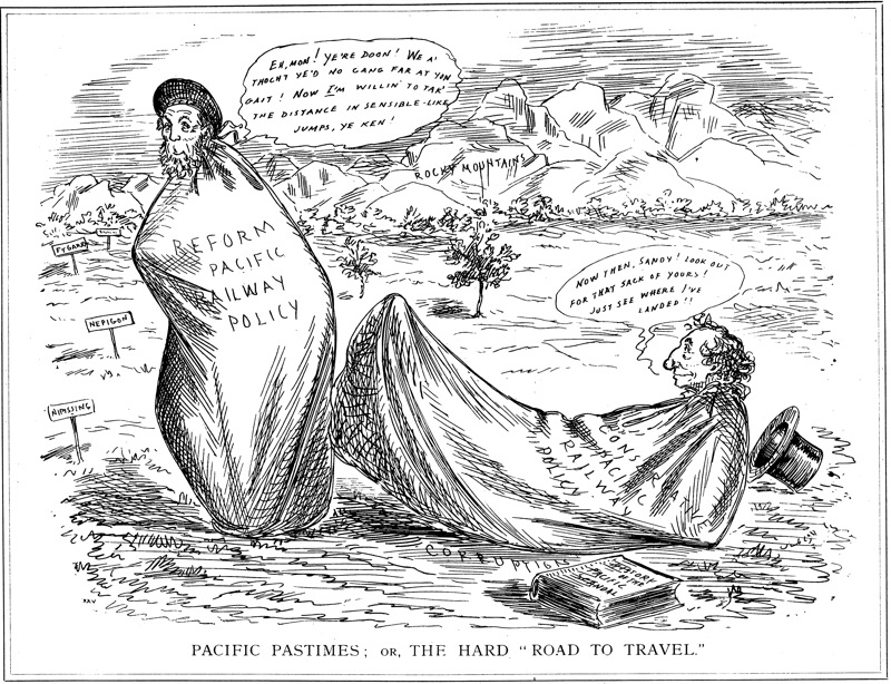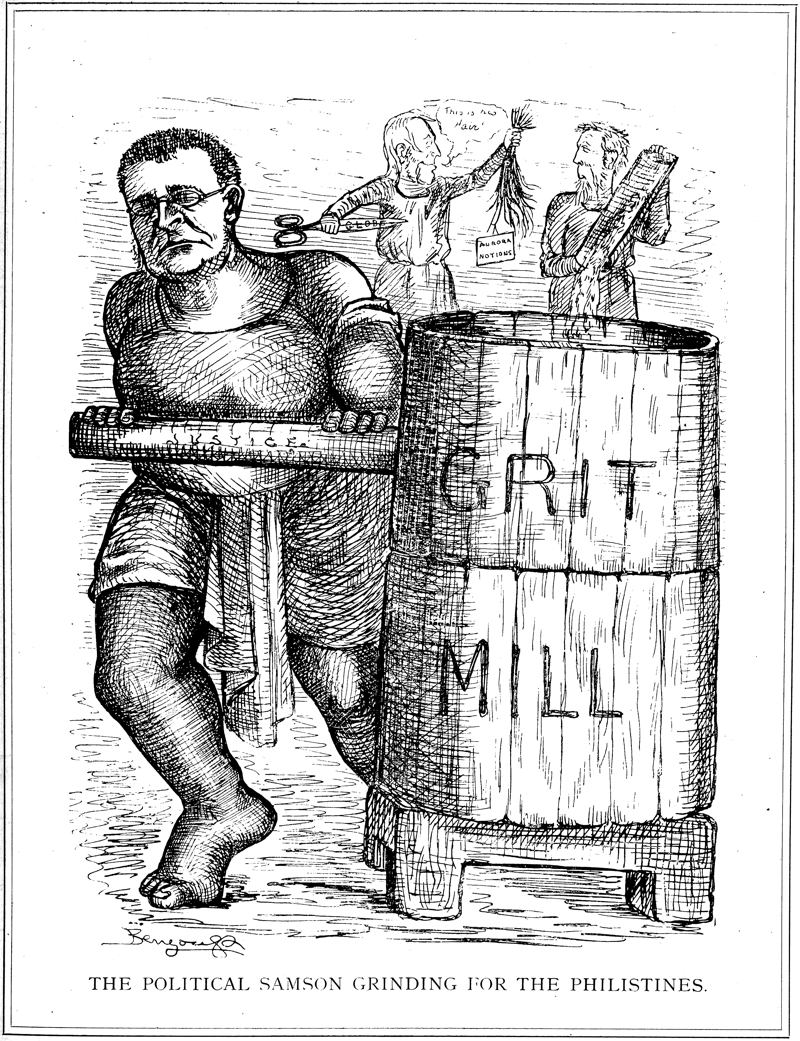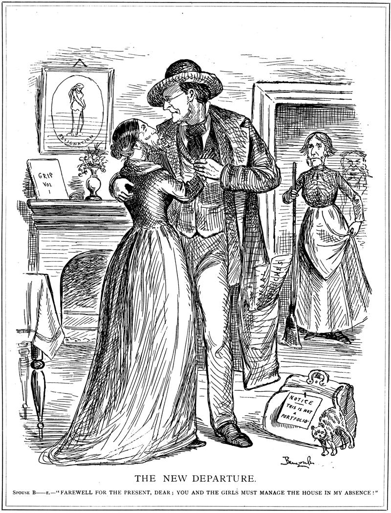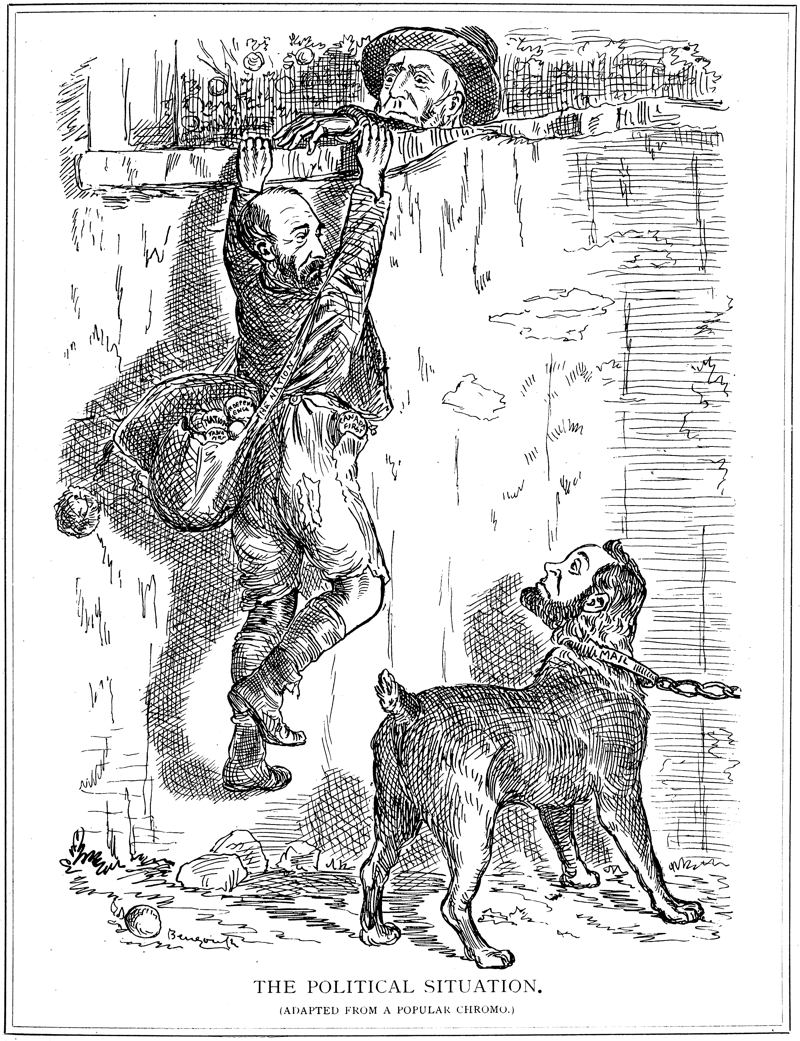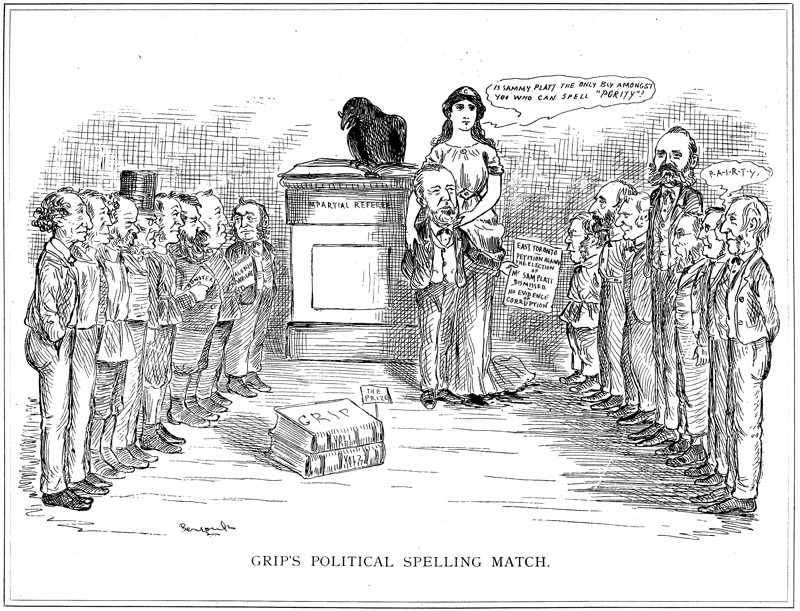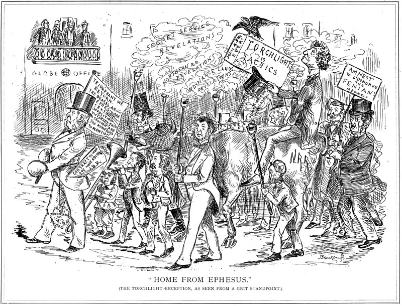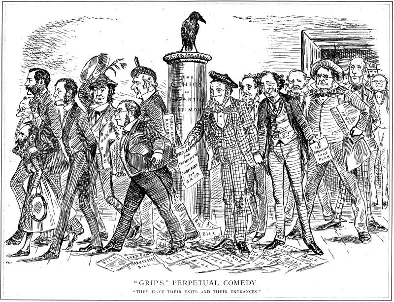 Every man should take an intelligent interest in the political life of his country. But from what quarter is he to get information? He cannot get Hansard; and even if he could, life is too short to read the terrible volumes. To trust himself to this or that party paper will insure interest but not intelligence; and to read the papers on both sides will land him in hopeless scepticism, or drown him “in a popular torrent of lies upon lies.” On the whole, he cannot do better than trust Grip, as the most honest interpreter of current events we happen to have. Grip, too, not only generally hits the nail on the head, but sometimes hits like a blacksmith—and we belong to a race that loves to see a blow well struck. Besides, the fellow has no malice in him. He has always a merry heart, and that doeth good like a medicine. Many a laugh he has given us, and laughter clears away unwholesome fogs from the spirit. Along with music it is next best to Holy Writ, according to the testimony of Martin Luther. A picture, too, has this unspeakable advantage over verbiage, that you can take in the situation at a glance, and if it is not agreeable, you can pass on. You condemn the representation as unfair, but, at any rate, your time is not lost.