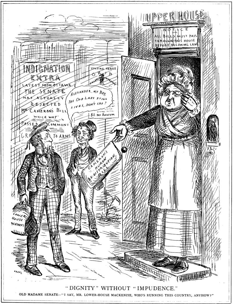 A young member of our House of Commons waxed eloquent in the course of his maiden speech, and, naturally enough, some of his brethren thought him mad. Not so thought Joseph Howe, to whom Shakespeare was dearer than all the Blue-books in the Parliamentary Library: “Thank God for a bit of poetry in this dry-as-dust House,” whispered the old man to a near neighbor. Yes, and thank God for Humor, with its intuitive perception of truth, and its consequent impartiality. Without Grip, what Saharas our Parliaments would be!