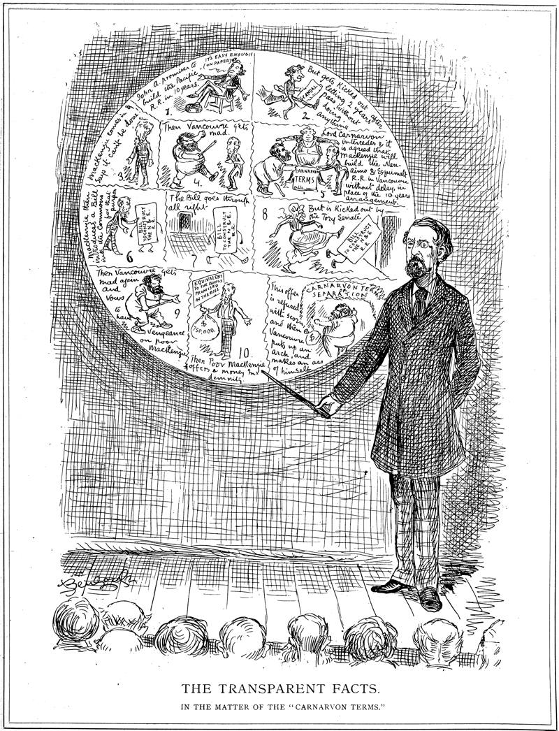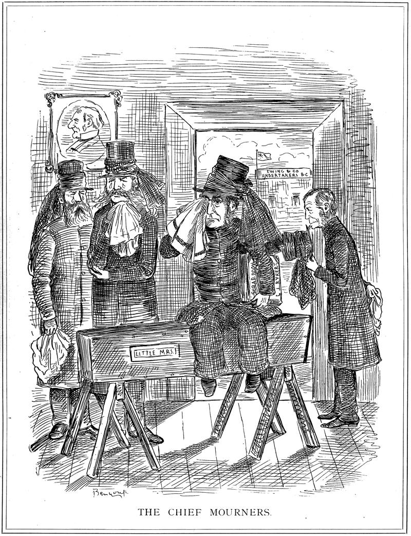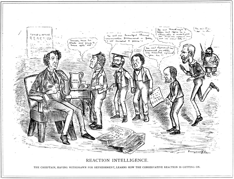 The Conservative press allowed nothing which could be construed as evidence of a reaction to pass without judicious comment. Amid the unquestionable signs of a change of public feeling there were occasional occurrences which furnished consolation to the Reform Party—such as the defeat of the Conservative Government in Quebec. The persons represented in the cartoon, besides Sir John Macdonald, are Hon. Charles Tupper, Mr. Mackenzie Bowell, Hon. H. Langevin, Hon. Peter Mitchell, Mr. Palmer (a Maritime Province representative) and Mr. Bunster, of British Columbia. The latter gentleman was well-known as an anti-Chinese agitator. Mr. (now Senator) Plumb, to whom reference is made, was a Member of the Opposition somewhat noted for long addresses in Parliament.