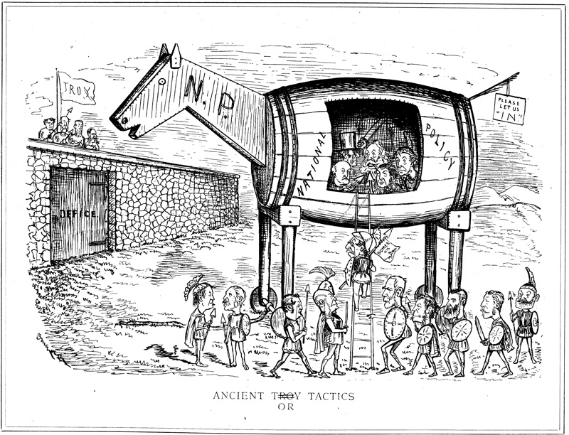 This was still another repetition of the opinion that the Tory Party, in adopting the National Policy, had in view the one grand object of “getting in” to office. The allusion is of course to the familiar classic story of the method adopted by the Greeks to gain admission to Troy.