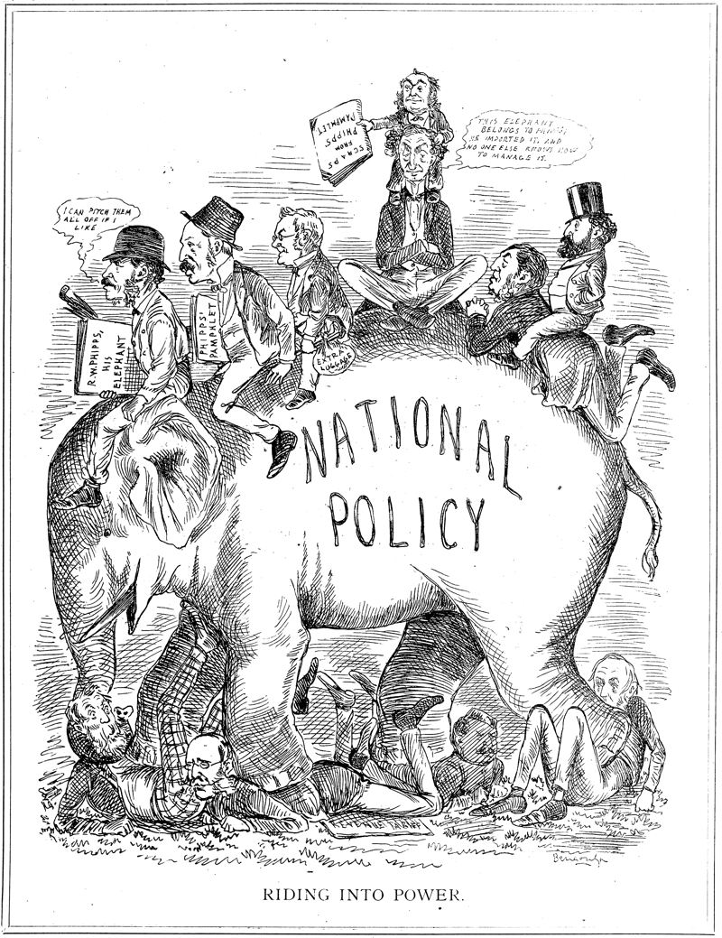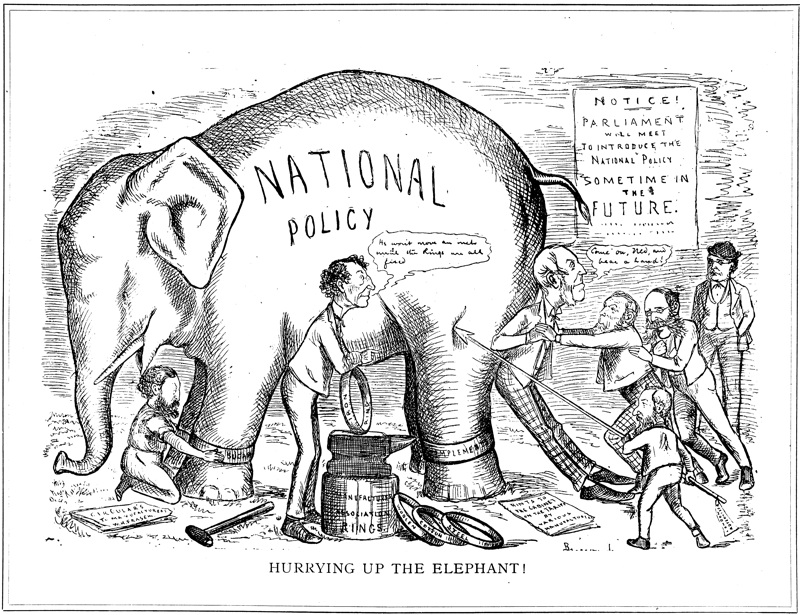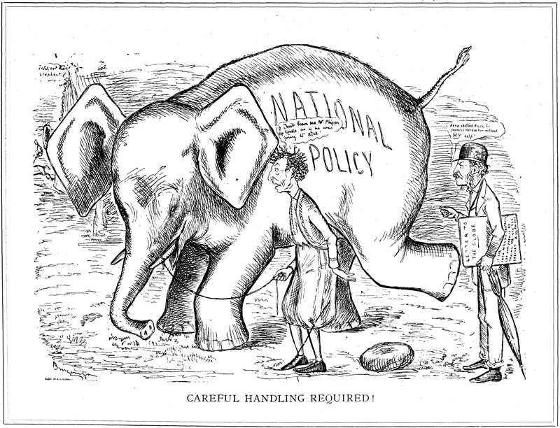 In anticipation of the difficulty the new Ministry would meet in reconciling the various conflicting trade interests in the promised tariff changes, the N. P. was referred to as a White Elephant—a beast proverbially awkward to have on hand. That the Policy had proved a particularly “happy thought” on the part of the Conservative leader was now manifest, for it is doubtful if anything excepting this adroit appeal to the people’s pockets could possibly have restored the Conservatives to power at this time.