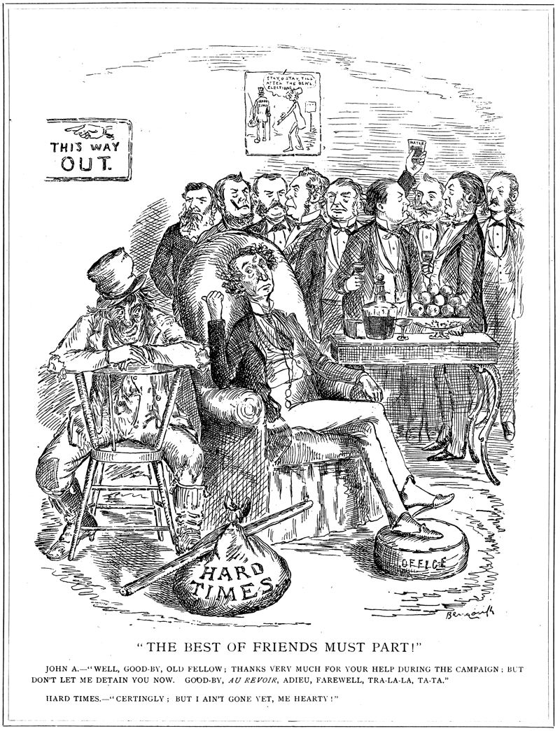 JOHN A.—“WELL, GOOD-BY, OLD FELLOW; THANKS VERY MUCH FOR YOUR HELP DURING THE CAMPAIGN; BUT DON’T LET ME DETAIN YOU NOW. GOOD-BY, AU REVOIR, ADIEU, FAREWELL, TRA-LA-LA, TA-TA.”