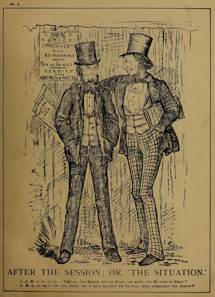On the 2nd April, 1873, Hon. L. S. Huntington, member for Shefford, from his place in the House, charged Sir John A. Macdonald, Premier of the Conservative Government, with having corruptly sold to Sir Hugh Allan, of Montreal, the Charter of the proposed Canadian Pacific Railway, for a large sum of money, which had been used as a Ministerial Bribery Fund in the preceding General Election. Shortly after this, and before any decided inquiry had been made into the matter, Parliament was adjourned (on May 23rd,) until the following 13th of August. The Cartoon playfully suggests the feeling of the Opposition, (represented by Hon. A. Mackenzie,) towards the accused ministry during the “vacation.”