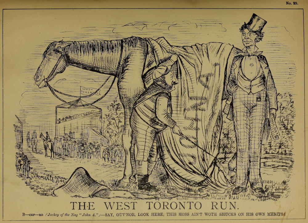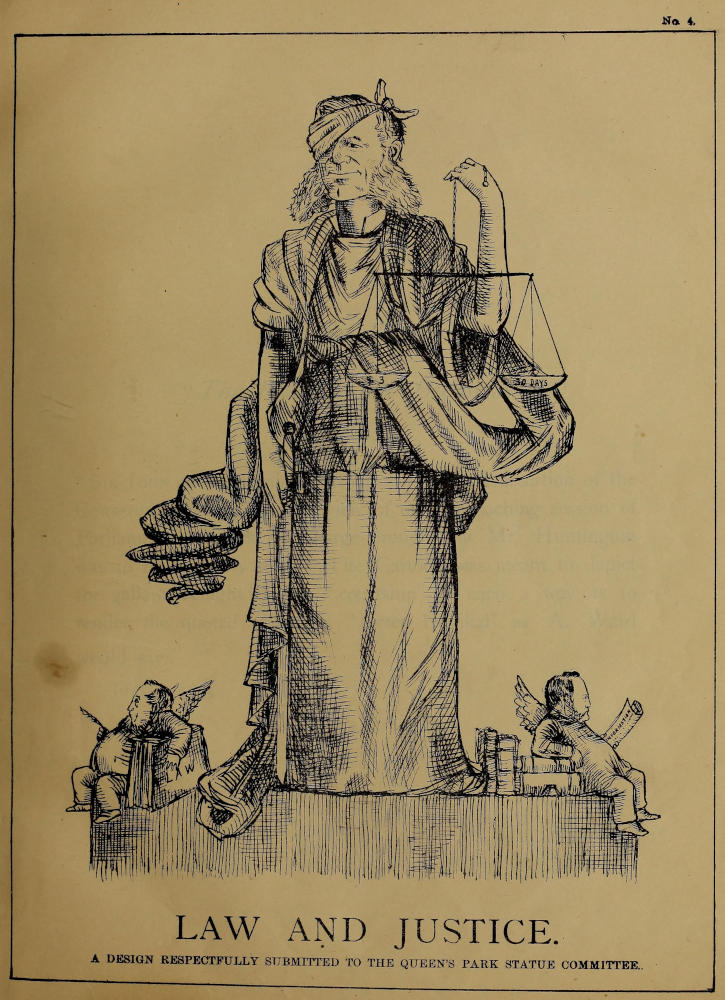 The advisability of removing the bronze statue of the Queen from the Park had been under discussion in the City Council, and created considerable interest. Grip, in this Cartoon, took the liberty of suggesting a work of art to supply the place of Mr. Marshall Wood’s figure. The persons represented are, in the centre, Mr. A. Macnab, Police Magistrate of Toronto; on the right, Mr. Nudell, a popular Court official; and on the left, Alderman John Baxter, J.P.