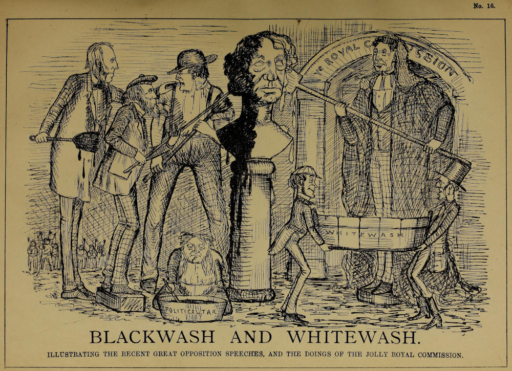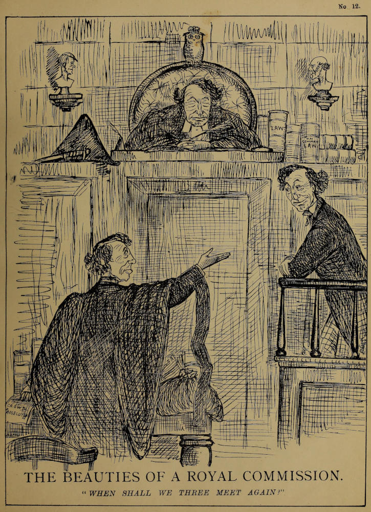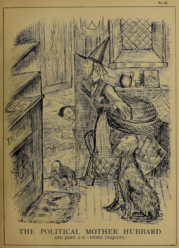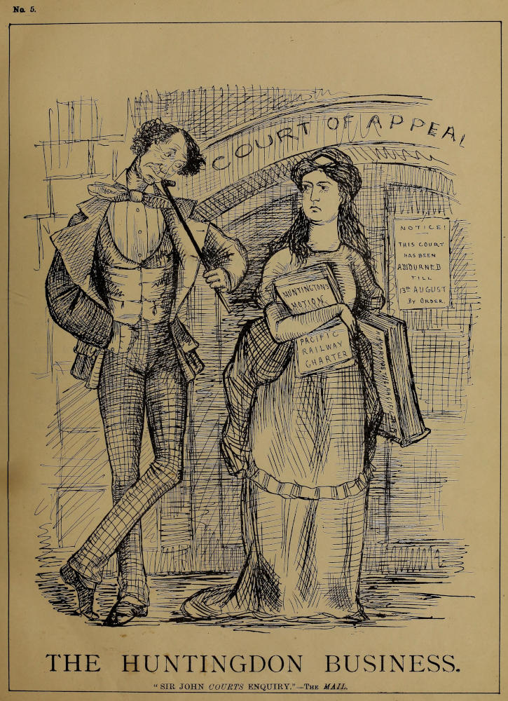 “Sir John courts enquiry” was the oft-repeated assertion of the Conservative newspapers, in view of the approaching session of Parliament at which the charge brought by Mr. Huntington was to be regularly tried. The Cartoon was meant to depict the gallant Knight in his “courtship” in such a way as to render the quoted statement “sorter Ironikal” as A. Ward would say.