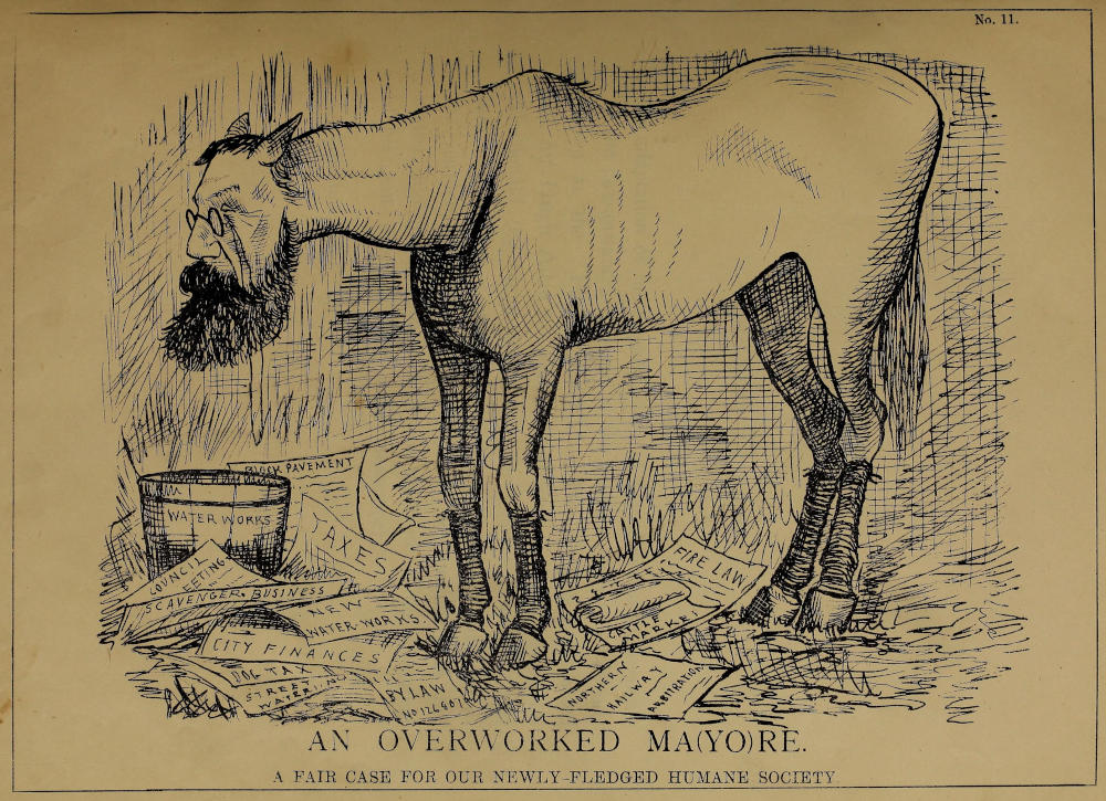 A palpable and surely a pardonable pun, seeing that its object was to pay a tribute to the official industry of the Civic Chief Magistrate for 1873—Alex. Manning, Esq. A branch of the Society of the Prevention of Cruelty, &c., had been established in the City shortly before the date of the cartoon.