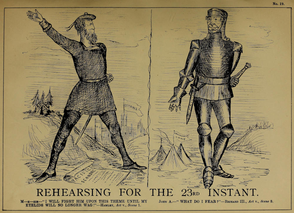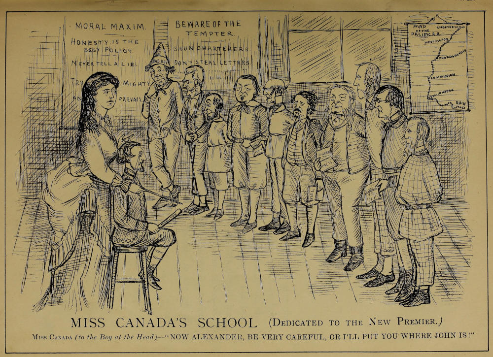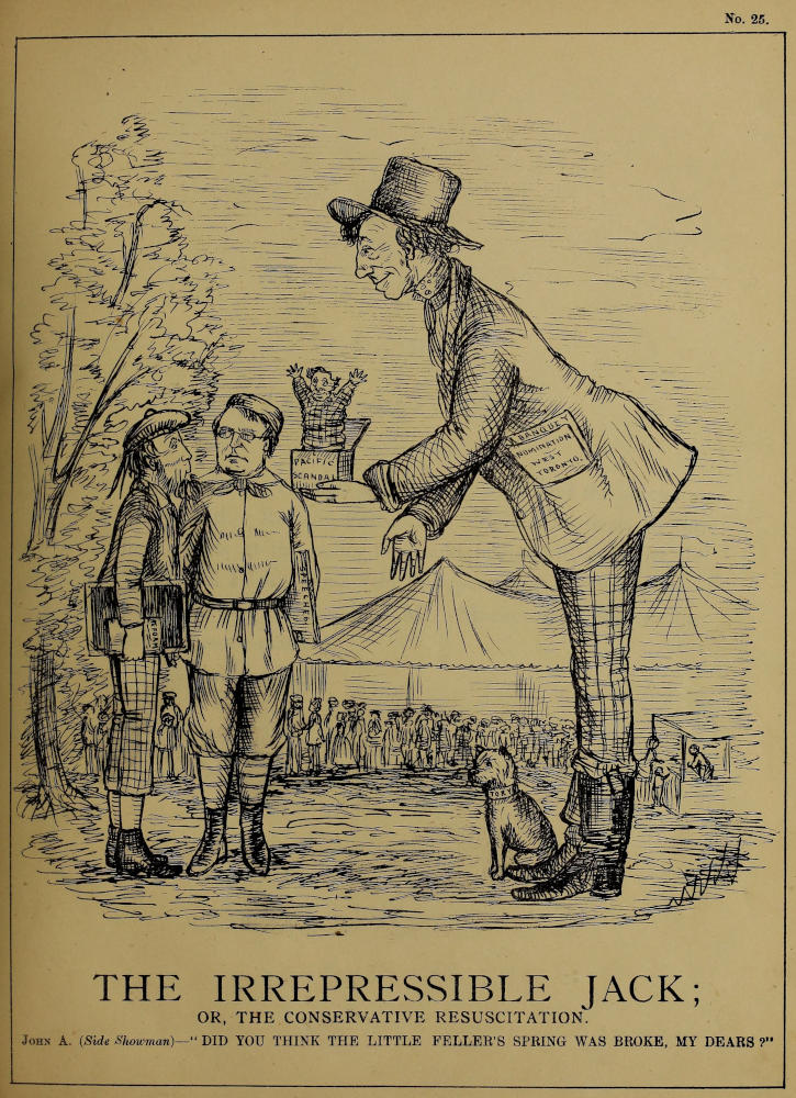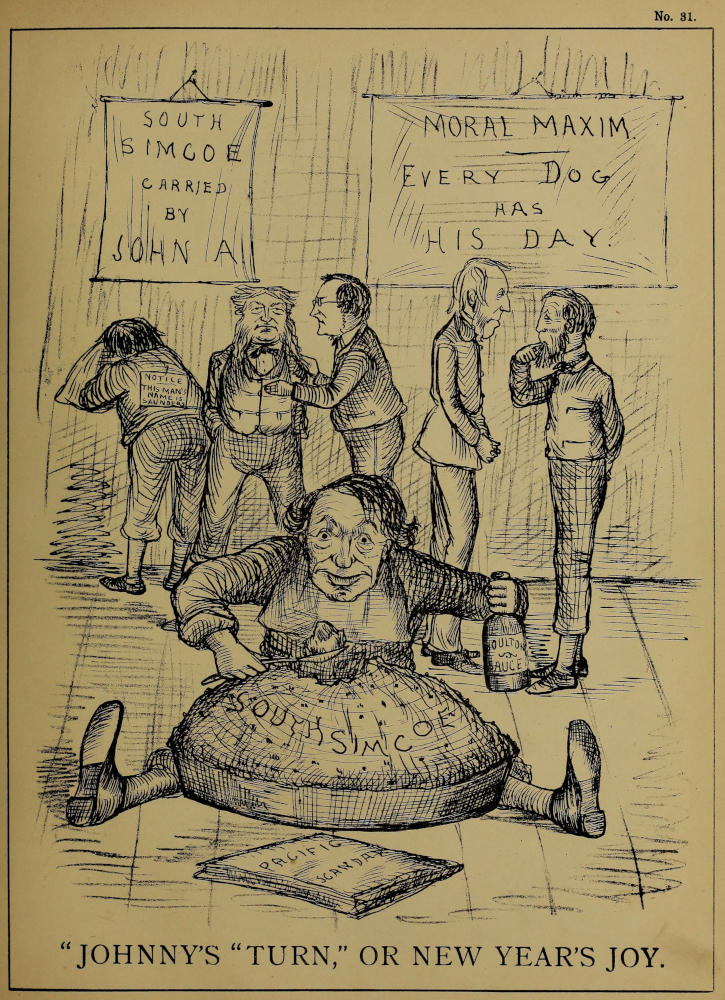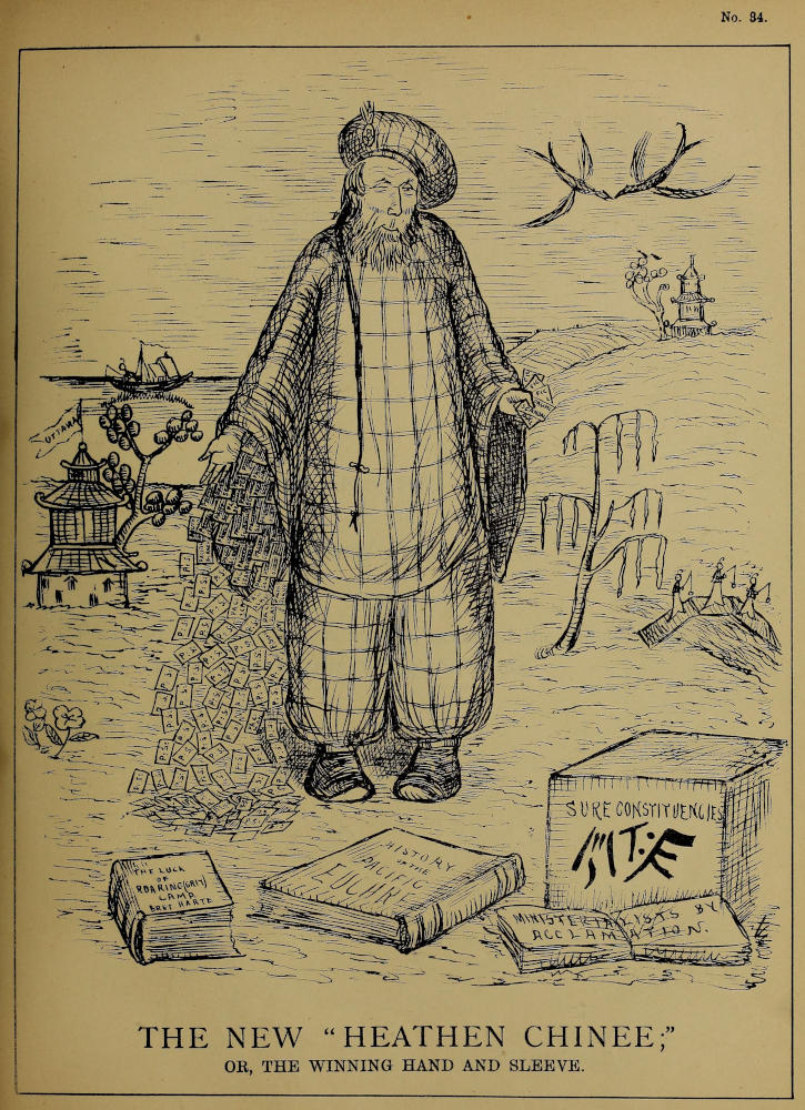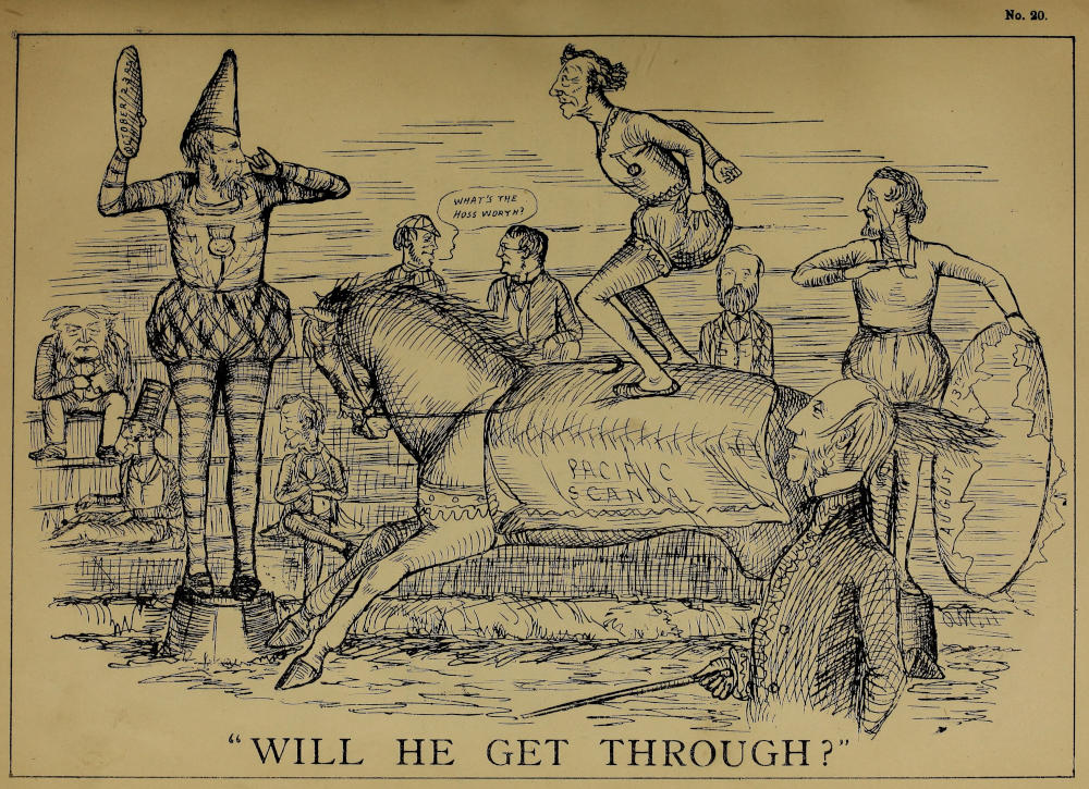 The analogy sought to be pointed out between the new Premier and Bret Harte’s famous “Ah Sin” was merely in the possession of a great advantage in the way of cards. Mr. Mackenzie went to the country with the “Pacific Scandal” for a text, and it proved as ruinous to the Conservative Party as Ah Sins “twenty-four packs” did to “Bill Nye” and his Pardner. This explanation is needed, as the cartoon was considered, by some who misunderstood it, to impugn the honesty of the gentleman represented.