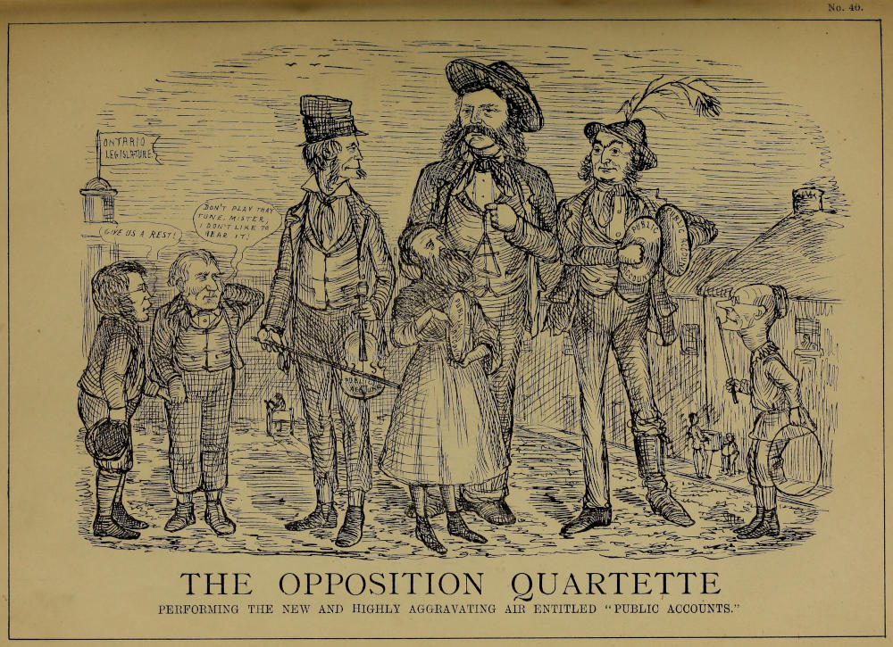 The most prominent members of the Opposition (Conservative) in the Ontario Legislature were Messrs. M. C. Cameron, Q.C., J. Chas. Rykert, A. W. Lauder and A. Boultbee. These gentlemen were always most active and energetic in their labour of fault-finding, and at the time of the Cartoon were ringing the changes on the public accounts of the Province, which were undergoing examination in Committee.