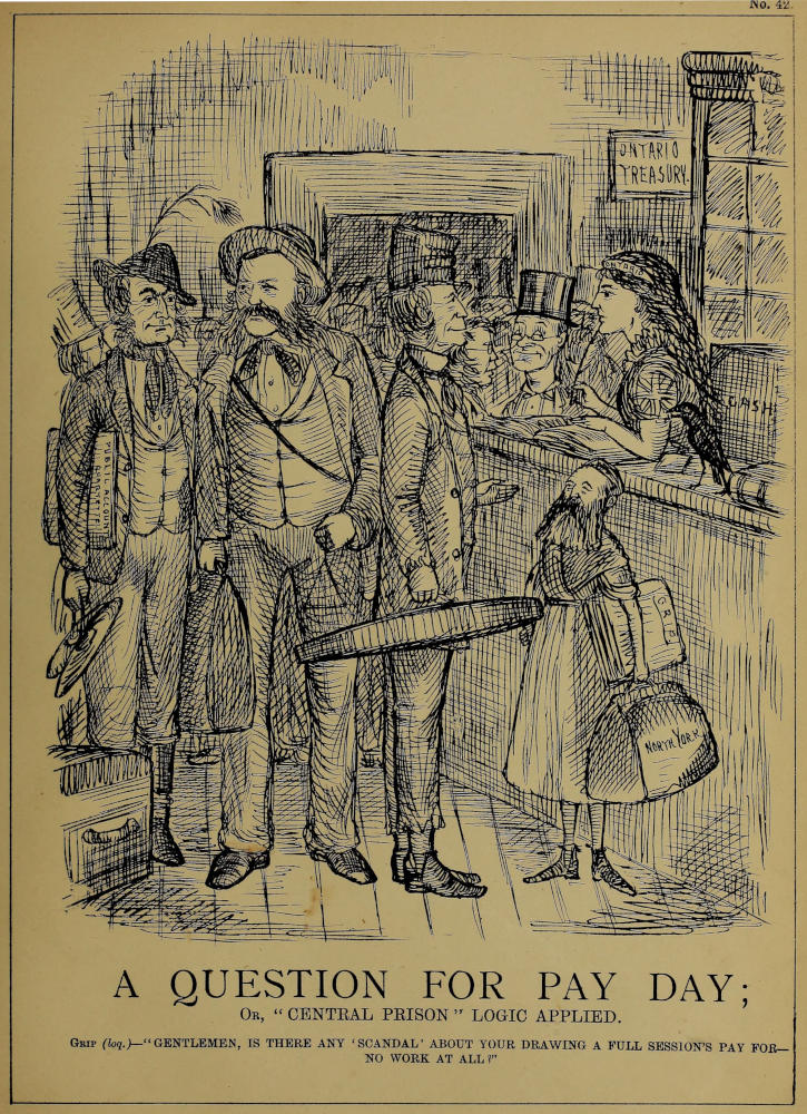 The “Opposition Quartette” had vigorously assailed the action of the Hon. A. McKellar for having, in his capacity as Minister of Public Works, granted a half holiday (at the public expense) to the workmen engaged in building the Central Prison at Toronto, to allow them an opportunity of attending a nomination meeting in the West Division of the city. In view of the meagre amount of work done on the left side of the Speaker during the Session, “Grip’s” question was quite logical.