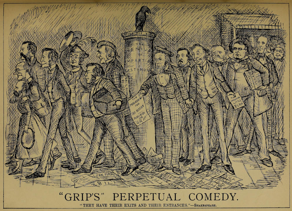 Here, O Public! here they are! You have been clamoring in the most importunate and flattering fashion for a re-issue of the Cartoons of Grip, and out of pure good humour, I have gone to work and re-drawn them for you, because, you must know, these destiny-shaping pictures were not originally engraved upon wood, but were produced by lithography, and in due time each was utterly erased from the stone to make way for bill-heads and cigar labels. This has been no light task, but of course my good will towards men, together with the anticipation of being an author and writing an “introduction,” made it a labour of love. Now, the fact of the public request aforesaid will spare me the usual editorial humiliation of an introductory apology; and I need say nothing here about the subject matter of the sketches, as I have written an explanatory note (comprehensive and lucid enough I hope) opposite to each, and, therefore, my prefatory remarks are complete—with, by the way, a word to the Critics. Dear Critics, I defy you to do your worst. This work, as you know in your heart of hearts, is above criticism. There are no errata to be found in the text, and no false perspective or other defects in the drawings. If you hit upon anything that may persuade you to the contrary pray don’t write it. Come and see me personally at No. 2 Toronto Street, where I have hung my basket, and every Saturday croak “Never Say Die” to an ever increasing circle of patrons. But what an ungrateful rook I am to be sure, thus impudently chattering to those who have shown me nothing but generosity during my career, and to be thus boring the generous Canadian Public who have, with unexampled goodness, bestowed their favours on