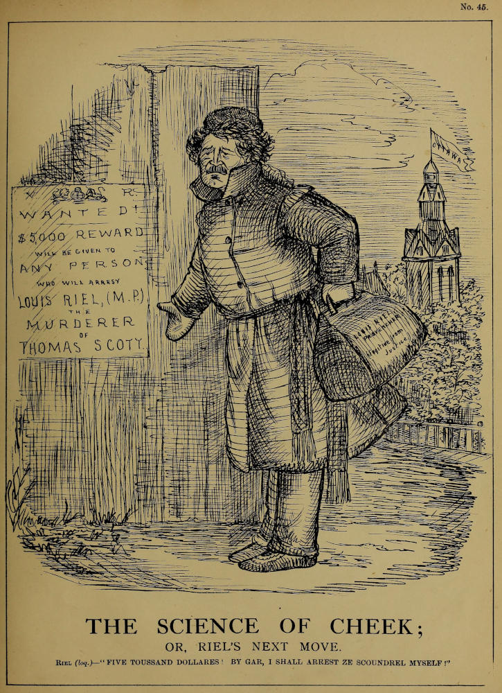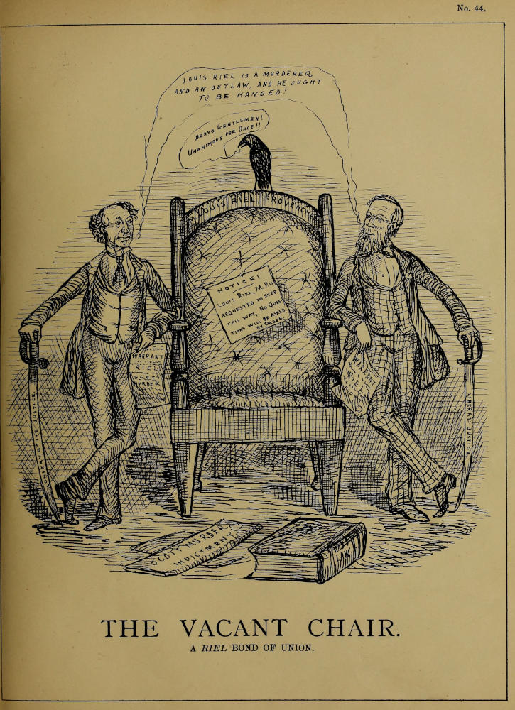 Louis Riel, the leader of the Red River Rebellion and alleged murderer of Thomas Scott, had been returned for Provencher, Manitoba, to the Dominion Parliament. He prudently failed to take his seat in the House, while the unanimity with which both sides cried for his arrest made “the vacant chair” a bond of union for the time being.