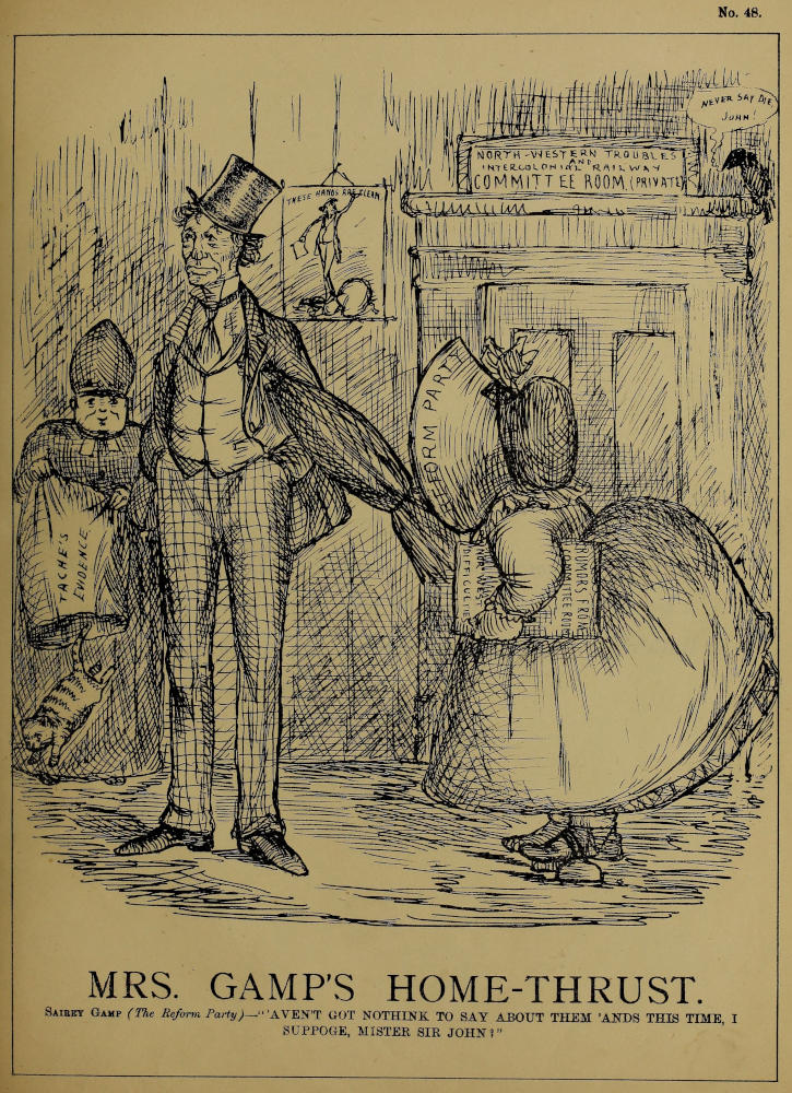 Sairey Gamp (The Reform Party)—“’AVEN’T GOT NOTHINK TO SAY ABOUT THEM ’ANDS THIS TIME, I SUPPOGE, MISTER SIR JOHN?”