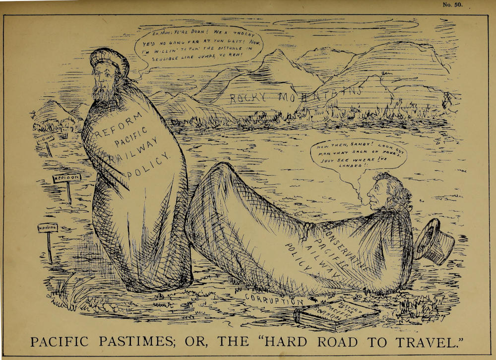 The Reform Government took up the Pacific Railway scheme, but initiated a new policy with regard to it. Sir John Macdonald had pledged the country to complete the entire work within ten years. Mr. Mackenzie characterized this as a physical impossibility, and proposed, as the cartoon has it, “to tak the distance in sensible like jumps, ye ken!”