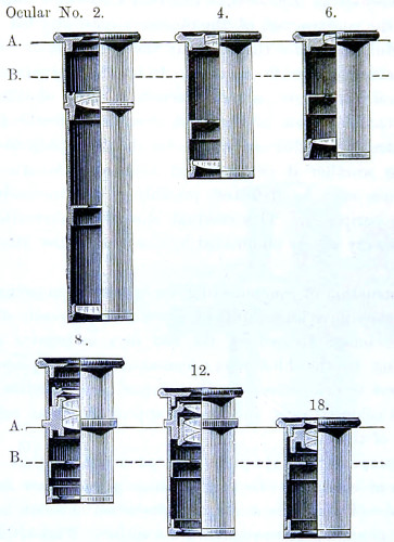 25 Messrs. Ross have two series of eye-pieces, both Huyghenian. One series is for use with the English 10-inch tube-body, and is distinguished by Roman letters, and the other by numerals, and made as is usual on the Continent, and for use with the shorter tube-body 6½-inch. The initial powers given in the table are for the 10-inch tube, and for the shorter must be read as follows:—