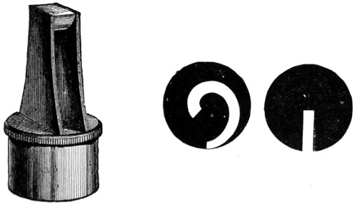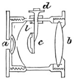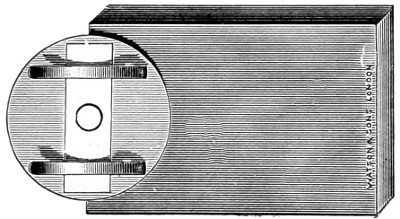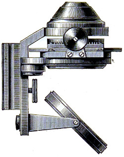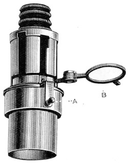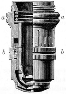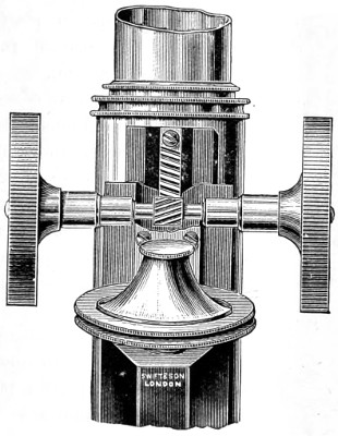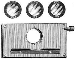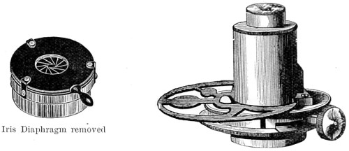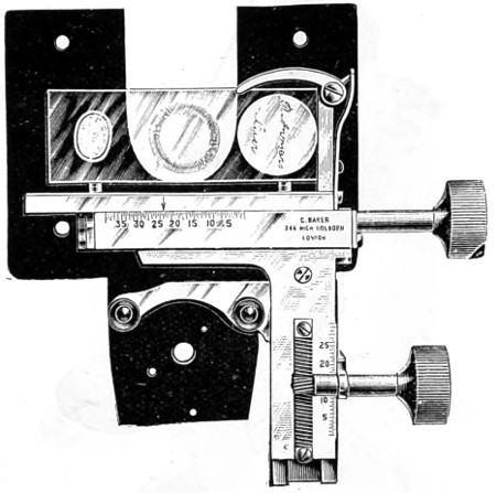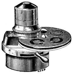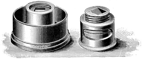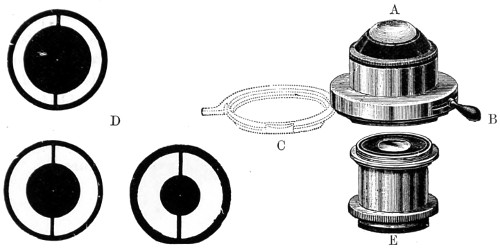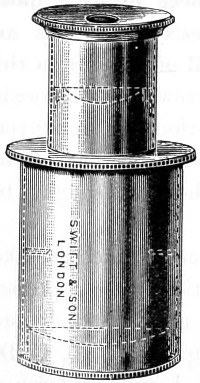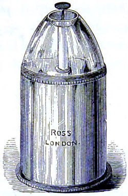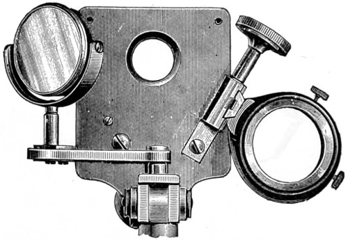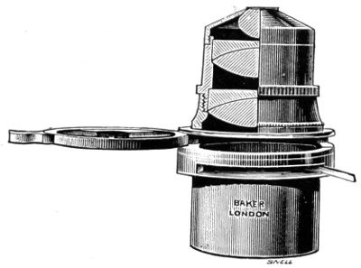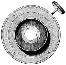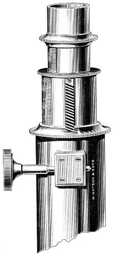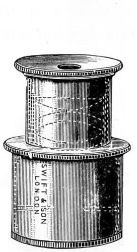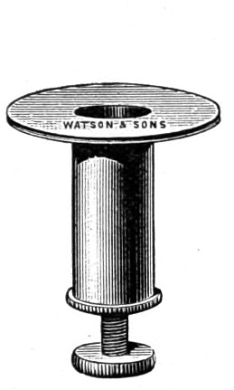 26 This centring-glass consists of a tubular cap with a minute aperture, containing two plano-convex lenses, so adjusted that the image of the aperture in the object-glass and the images of the aperture of the lenses and the diaphragms contained in the tube which holds the illuminating combination, may be all in focus at the same time, so that by the same adjustment they may be brought sufficiently near to recognise their centricity.