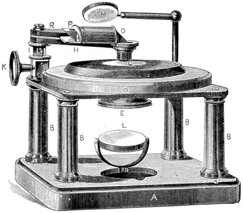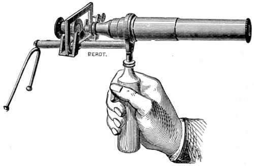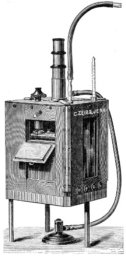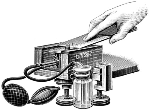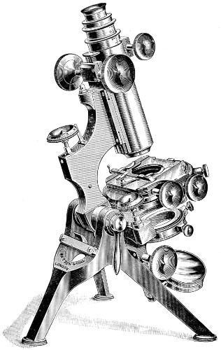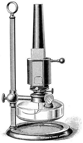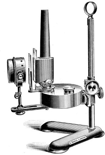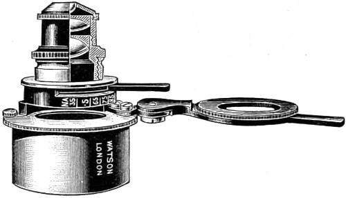 A step has already been taken in another direction, that of furnishing special forms of instruments, better adapted to the uses to which they will hereafter be put, and purposely designed for chemical and analytical processes, for petrological pursuits, the geometrical measurement of crystals, for special work in connection with manufacturing industries, for the dairyman, and the farmer. For the detection of adulterations—that of butter, for example—a newer form of instrument has been devised, namely, a “Butro-refractometer,” by the help of which any adulteration of this universal article of diet will at once be revealed. The form of instrument upon which the optician has expended a greater amount of skill than perhaps on any other is the Bacteriological Microscope, as may be inferred from the larger space I have devoted to this important adjunct, since by original research, there can be no doubt a still greater future is in store for science in this special department of microscopy. But perfect success in this direction remains very much with the practical optician, and the further improvements made in the optical part of the instrument, since it is admitted that the highest theoretical perfection has not yet been reached.