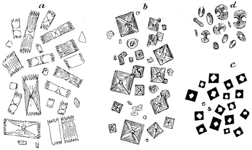 33 Herapath’s test-fluid is a mixture of three drachms of pure acetic acid, one drachm of alcohol, and three drops of sulphuric acid.
