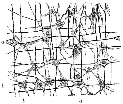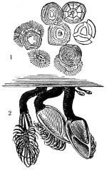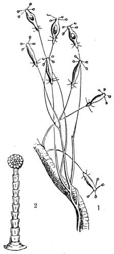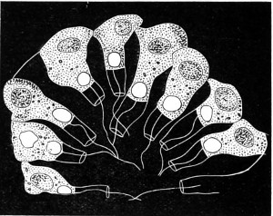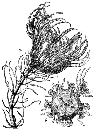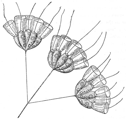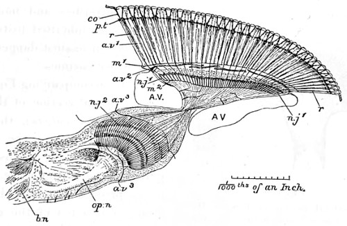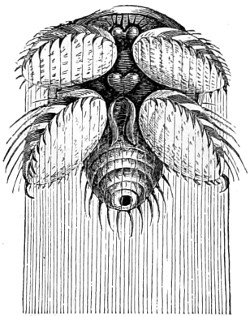 70 Fritz Müller first demonstrated a nervous system in the Polyzoa:—“The nervous system of each branch consisting of—1st, a considerable sized ganglion situated at its origin; 2nd, of a nervous trunk running the entire length of the branch, at the upper part of which it subdivides into branches, going to the ganglia of the internodes arising at this part; and 3rd, of a rich nervous plexus resting on the trunk, and connecting the ganglia just mentioned, as well as the basal ganglia of the individual polypides.” For further account, see paper in the “Micros. Journ.,” vol. i., New Series, p. 330.