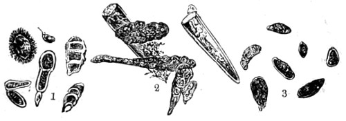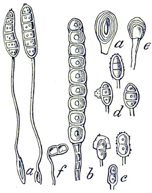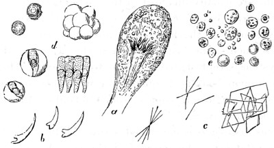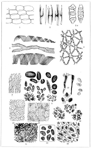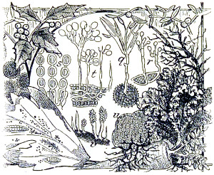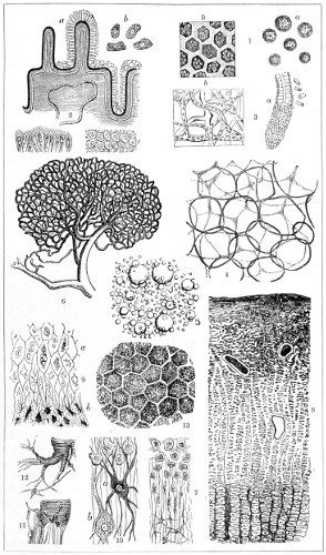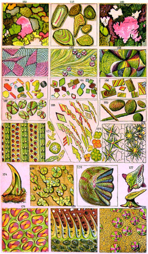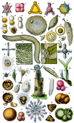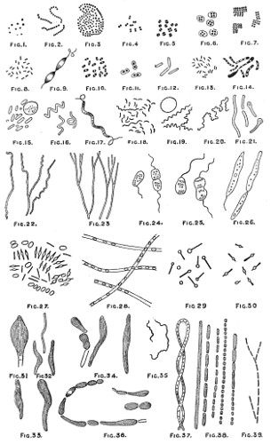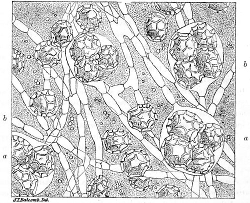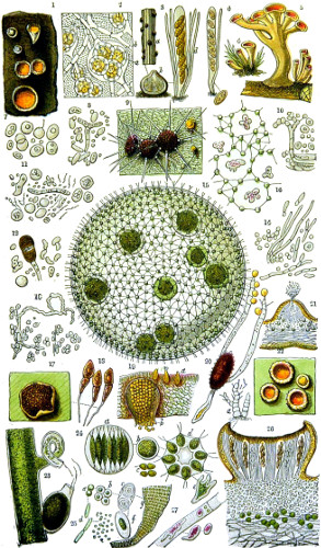 Fig. 1. Peziza bicolor—2. Truffle: a. ascus of spores; b. mycelium—3. Sphæria herbarum: a. piece of dead plant, with S. herbarum natural size; b. section of same, slightly magnified; d. Ascus with spores, and paraphyses more magnified—4. Peziza pygmæa—5. Apical form of same—6. P. corpulasis: Ascus with spores and paraphyses, merely given as a further illustration of structure in Peziza—7. Yeast healthy—8. Yeast exhausted—9. Phyllactinia guttata—10. Yeast with favus spores and mycelium of fungus—11. Favus ferment, with oïdium and bacteria—12. Puccinia spores, growing in a saccharine solution—13. Aerobic bacteria—14. Spores and mycelia from eczema produced by yeast—15. Volvox globator—16. Amœboid condition of portion of volvox—17. Puccinia buxi—18. Ditto, more enlarged—(17 to 20 illustrate Ascomycetes.)—19. Æcidium grossulariæ from transverse section of leaf of currant: a. spermogones on upper surface; b. perithecia with spores—20. Phragmidium bulbosum, development of—21. Palmella parietina, trans. section through a spermogone, showing green gonidia and spermatia escaping—22. Æcidium berberida, from leaf of berberry—23. Vaucheria sessilis—24. Stephanosphæra pluvialis: a. Full-grown example, germ cells spindle-shaped with flagella; b. Resting-cell; c. division into four; d. Free-swimming ciliated young specimen; e. Amœboid condition—25. a, b, c, d, e, f and g, Development of lichen gonidia—26. Palmella stellaris (lichen), vertical section through apothecium, showing asci, spores, and paraphyses, with gonidia and filamentous medulla: a. Spermatophore with spermatia—27. Moss gonidia assuming amœboid form.