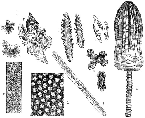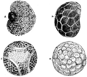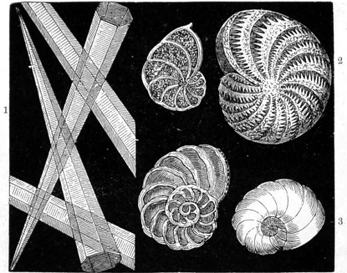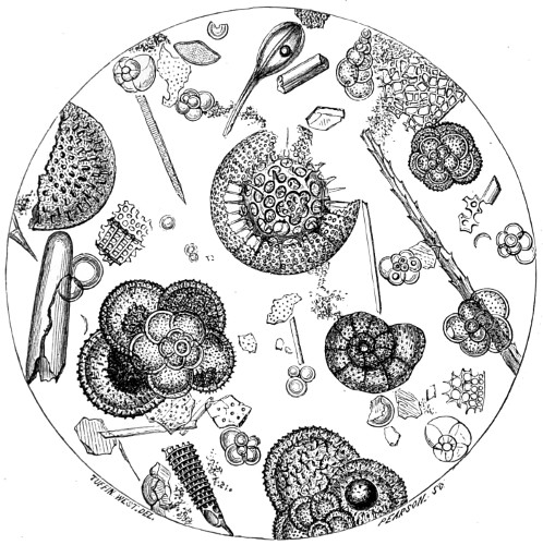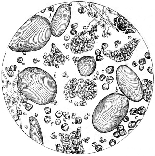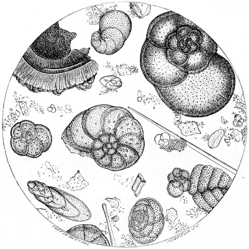 65 Among the more important works on Foraminifera for consultation will be found D’Orbigny’s “Foraminiferes Fossiles du Bassin Tertiaire de Vienne” (Autriche); Schultze, “Ueber den Organismus der Polythalamien,” 1854; Carpenter and Williamson’s “Researches on the Foraminifera,” “Phil. Trans. 1856;” Parker and Rupert-Jones in the “Annals of Natural History.” Specimens of Foraminifera may be obtained by shaking dried sponges; but if required alive they must be dredged for, or picked off the fronds of living seaweeds, over the surface of which they are, by the aid of a lens, seen to move.