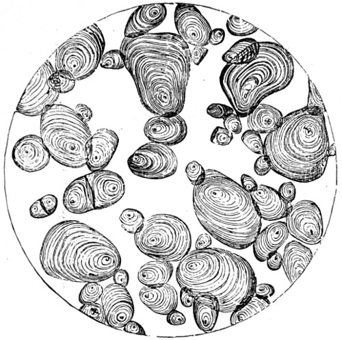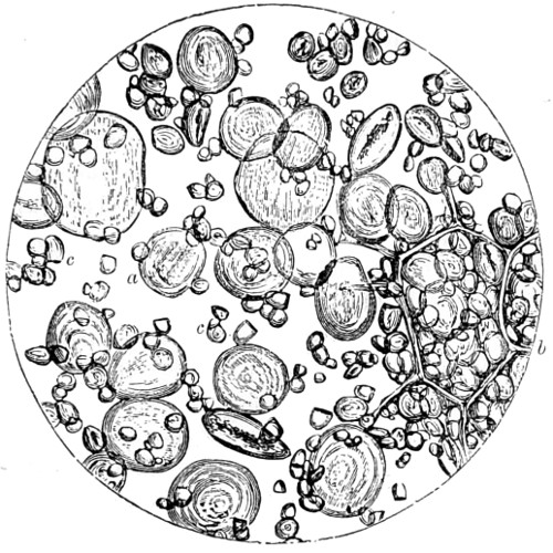 In the study of Vegetable Physiology, the Microscope is an indispensable instrument; it enables the student to trace the earliest forms of vegetable life, and the functions of the different tissues in the growth of plants. Valuable assistance is derived from its agency in the detection of adulterations. In the examination of flour, an article of so much importance to all, the Microscope enables us to judge of the size and shape of the starch-grains, their markings, their isolation and agglomeration, and thus to distinguish the starch-grains of one meal from those of another. It detects these and other ingredients, invisible to the naked eye, whether combined in xi atoms or aggregated in crystals, which adulterate our food, our drink, and our medicines. It discloses the lurking poison in the minute crystallisations which its solutions precipitate. “It tells the murderer that the blood which stains him is that of his brother, and not of the other life which he pretends to have taken; and as a witness against the criminal, it on one occasion appealed to the very sand on which he trod at midnight.”