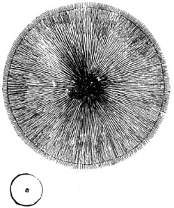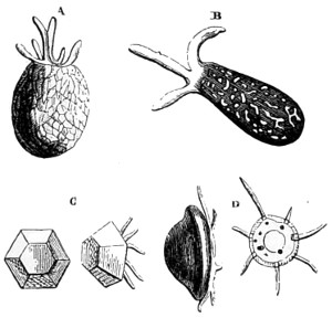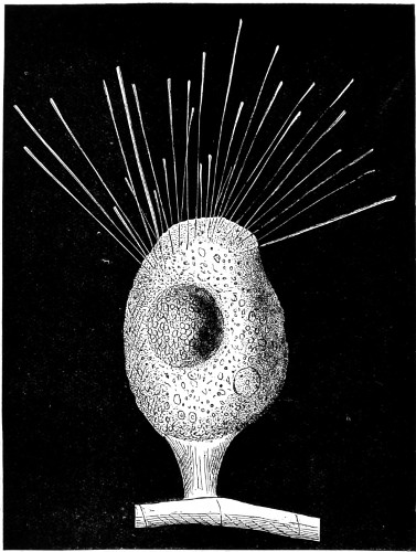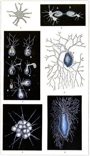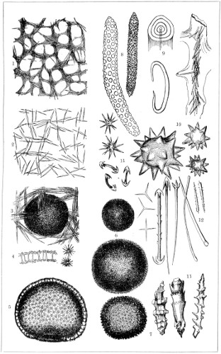 In this Plate Fig. 1 shows the elegant lattice-sphere of Rhizosphæra; Fig. 2 represents Sphærozoum, whose skeleton consists of loose spicules, arranged tangentially; Actinomma, Fig. 3, possesses three concentric lattice-spheres, joined by radiating spines; Figs. 4, 5, and 6, represent Lithomespilus, Ommatocampe, and Carpocanium; Fig. 7 represents a deep-sea form (Challengeria), whose oval case is formed of a regular, very fine-meshed, network; Fig. 8 depicts the elegant lattice-sphere of Heliosphæra; Figs. 9 and 10, Clathrocyclas and Dictyophimus.