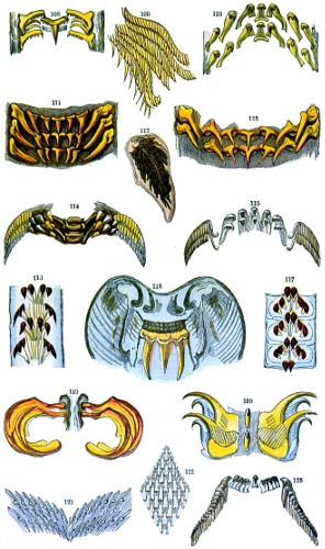 Figs. 43, 44, 45, 46, 47, 48, 49, 50, 51, 52. These figures are from drawings made by Major Owen, to illustrate forms of living Polycystina, sketched from life; these convey a faint idea of the richly coloured appearance of the natural structure; Figs. 48 to 52—53. Gregarina lumbricorum, round form—54. Gregarina lumbricorum, the usual elongated form—55. Gregarina serpulæ—56. Gregarina Sieboldii; illustration of septate form, with reflexed hook-like processes—57. Gregarina lumbricorum, encysted—58. Gregarina lumbricorum, more advanced and pseudo-navicellæ forming—59. Gregarina lumbricorum, free pseudo-navicella of—60, 61. Gregarina lumbricorum, amœboid forms of—62. Cruciate sponge-spicule—63. Astromma Humboldtii—64. Eözoon Canadense, represents appearance of a portion of the natural size—65. Eözoon Canadense, magnified, showing portions of cell-walls left uncoloured, the animal sarcode inhabiting it coloured dark green as in nature, and converted by fossilisation into a silicious mineral; the narrow bands passing between these are processes (stolons) of the same substance—66. Actinophrys sol, budding—67. Euglena viridis: a. contracted; b. elongated form—68. Acineta tuberosa—69. Œcistes longicornis (Davis)—70. Oxytricha gibba (side view)—71. Oxytricha pellionella—72. Thuricola valvata, expanded—73. Cyclidium (glaucoma)—74. Oxytricha scintillans—75 to 79, 80 to 85, illustrate types of Foraminifera discovered by Major Owen, living—75. Globigerina acerosa, n. sp., broken open to show interior—76. Globigerina, n. sp., broken open to show interior—77. Globigerina hirsuta—78. Globigerina universa—79 and 81. G. Bulloides—80. Conochilus vorticella—82. Globigerina inflata, sinistral shell—83. Pulvinulina Micheliniana—84. P. Canariensis—85. P. Menardii.