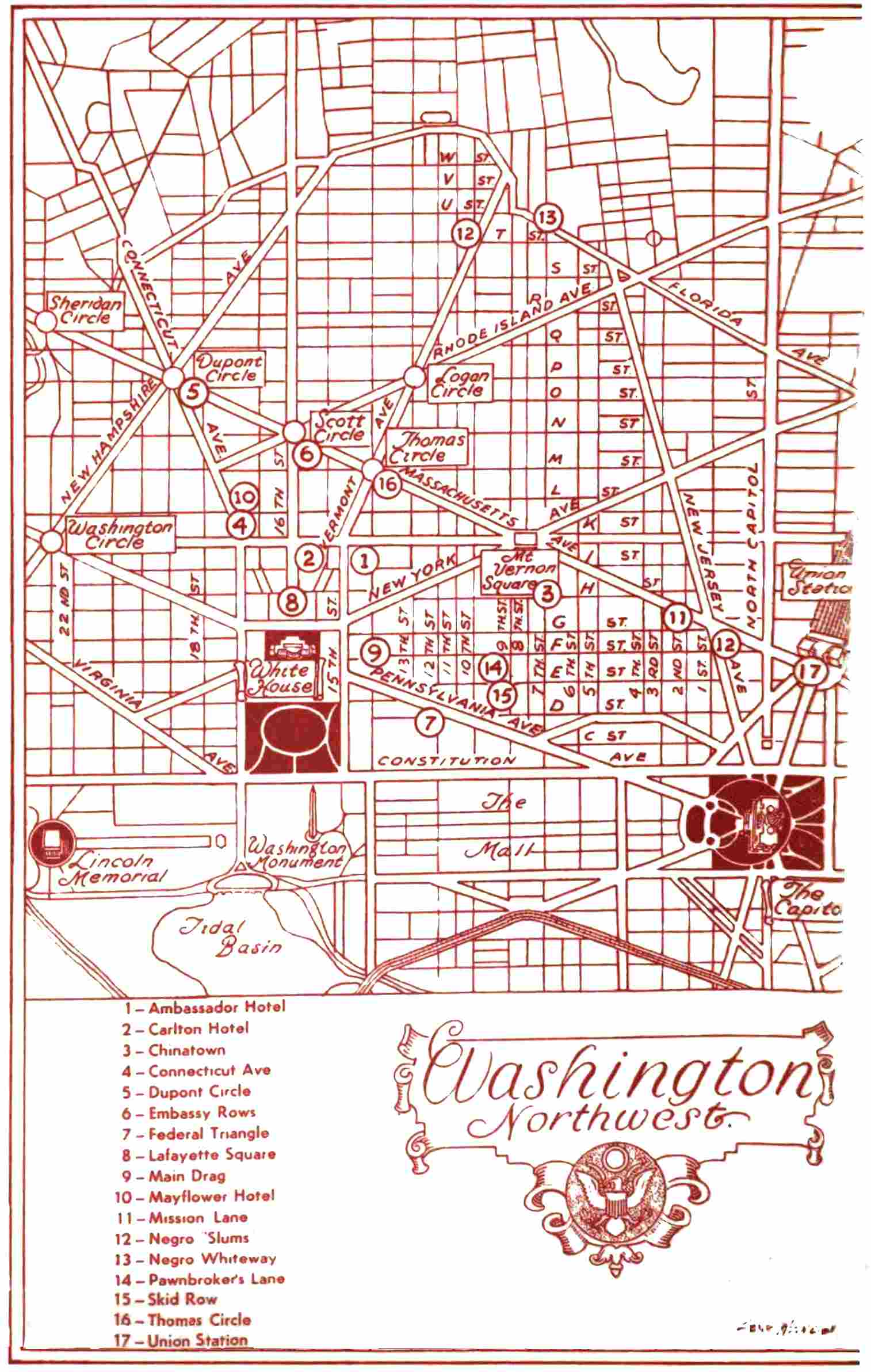 | 3. | NW COULD MEAN NOWHERE North West is the only section of Washington which counts. On the other hand, what is there in it you won’t find in Denver, Detroit or Dubuque, except the White House? |