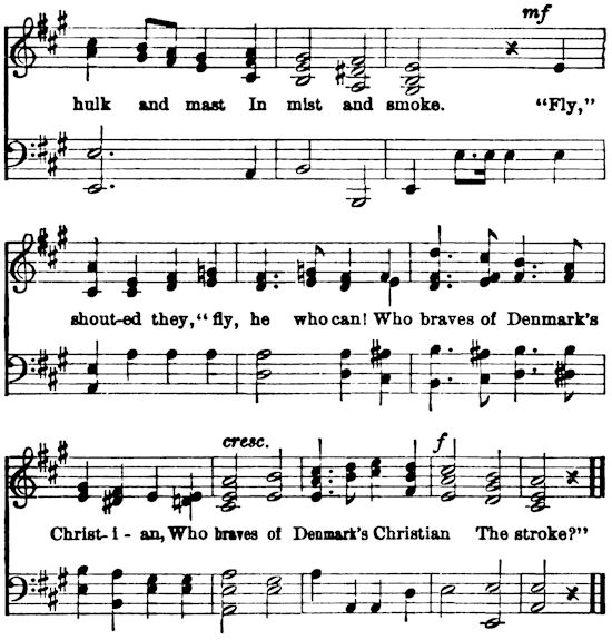 When the hull of the Prince Christian was literally knocked to pieces, and of her 576 men 69 lay dead and 137 wounded, including the chief and all of his officers who were yet alive, Captain Jessen determined as a last desperate chance to run one of his opponents down and board her with what remained of his crew. But his officers showed him that it was impossible; the ship could not be manœuvred. There was a momentary lull in the fire and out of the night came a cry, “Strike your colors!” The Danish reply was a hurrah and a volley from all the standing guns. Three broad-sides crashed into the doomed ship in quick succession, and the battle was over. The Prince Christian stood upon the shore, a wreck.