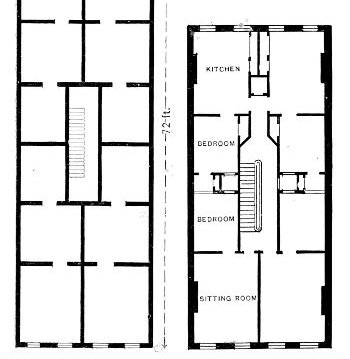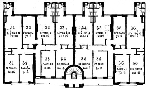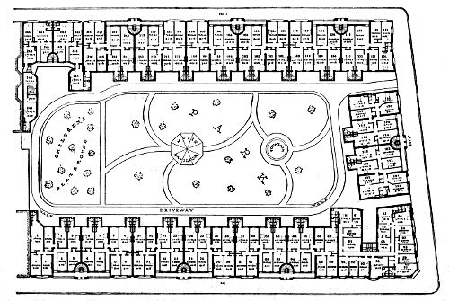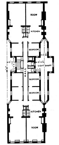 [4] This “unventilated and fever-breeding structure” the year after it was built was picked out by the Council of Hygiene, then just organized, and presented to the Citizens’ Association of New York as a specimen “multiple domicile” in a desirable street, with the following comment: "Here are twelve living-rooms and twenty-one bedrooms, and only six of the latter have any provision or possibility for the admission of light and air, excepting through the family sitting- and living-room; being utterly dark, close, and unventilated. The living-rooms are but 10 × 12 feet; the bedrooms 6½ × 7 feet.“