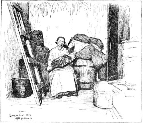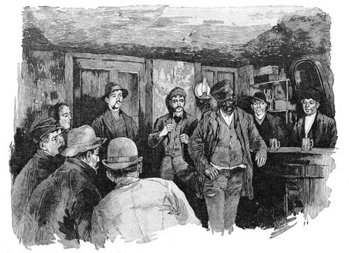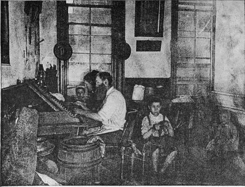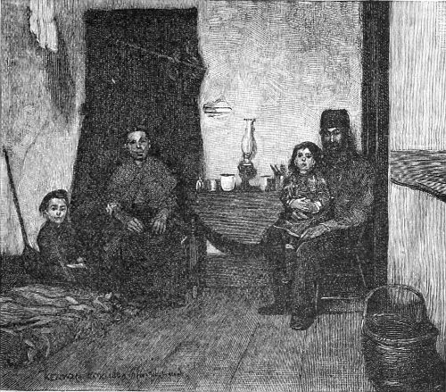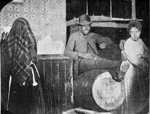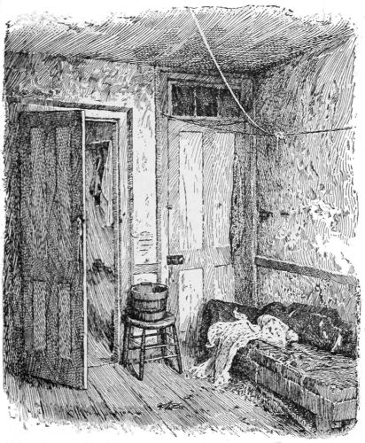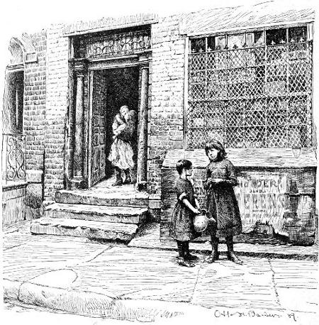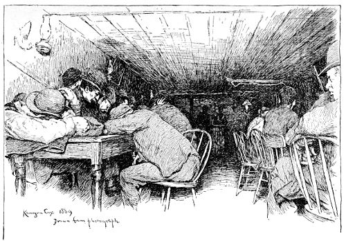 [17] Suspicions of murder, in the case of a woman who was found dead, covered with bruises, after a day’s running fight with her husband, in which the beer jug had been the bone of contention, brought me to this house, a ramshackle tenement on the tail-end of a lot over near the North River docks. The family in the picture lived above the rooms where the dead woman lay on a bed of straw, overrun by rats, and had been uninterested witnesses of the affray that was an everyday occurrence in the house. A patched and shaky stairway led up to their one bare and miserable room, in comparison with which a white-washed prison-cell seemed a real palace. A heap of old rags, in which the baby slept serenely, served as the common sleeping-bunk of father, mother, and children—two bright and pretty girls, singularly out of keeping in their clean, if coarse, dresses, with their surroundings. The father, a slow-going, honest English coal-heaver, earned on the average five dollars a week, “when work was fairly brisk,” at the docks. But there were long seasons when it was very “slack,” he said, doubtfully. Yet the prospect did not seem to discourage them. The mother, a pleasant-faced woman, was cheerful, even light-hearted. Her smile seemed the most sadly hopeless of all in the utter wretchedness of the place, cheery though it was meant to be and really was. It seemed doomed to certain disappointment—the one thing there that was yet to know a greater depth of misery.
