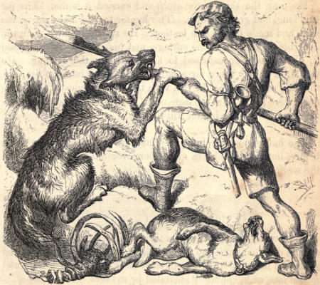 The man thrust the spear at the wolf’s mouth, but the ferocious beast evaded the blow, and seized the shaft of the spear between his teeth. Then the great combat came on. Very soon the dog sprang up and seized the wolf by the throat, and held him down, and finally the man killed him with his spear.