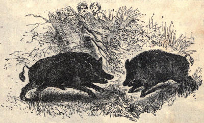 The wild boar is one of the most terrible of these animals. He has long tusks projecting from his jaws. These serve him as weapons in attacking his enemies, whether dogs or men. He roams in a solitary manner among the mountains, and though he is very fierce and savage in his disposition, he will seldom molest any one who does not molest him. If, when he is passing along through the forests, he sees a man, he pays no regard to him, but[17] goes on in his own way. If, however, when he is attacked by dogs, and is running through the forest to make his escape, he meets a man in his way, he thinks the man is the hunter that has set the dogs upon him, or at least that he is his enemy. So he rushes upon him with terrible fury, and kills him—sometimes with a single blow—and then, trampling over the dead body, goes on bounding through the thickets to escape from the dogs.