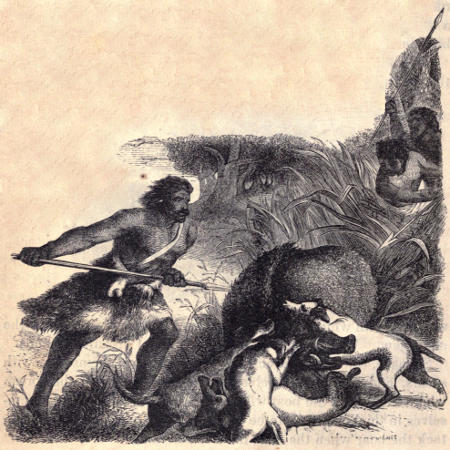 Savages, when they attack the wild boar, arm themselves with spears, and station themselves at different places in the forest, where they think the boar will pass. Sometimes they hide themselves in thickets, so as to be ready to come out suddenly and attack the boar when the dogs have seized him.