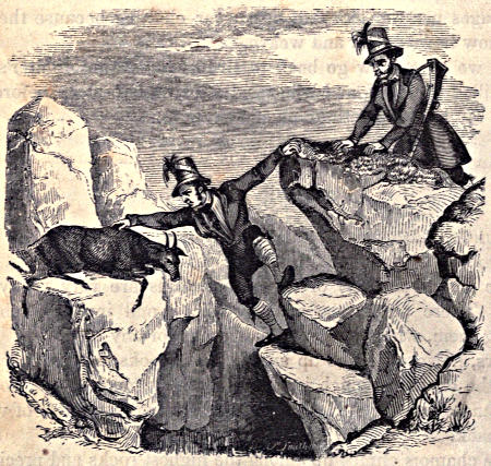 The chamois climbs up among the highest rocks and precipices to feed upon the grass which grows there in the little nooks and corners. The chamois hunters climb up these after him. They take guns with them, in order to shoot the chamois when they see one. But sometimes it is difficult for them to get the game when they have killed it, as we see in this engraving. The hunters[20] were on one side of a chasm and the chamois on the other, and though he has fallen dead upon the rocks, they can not easily reach him. One of the hunters is leaning across the chasm, and is attempting to get hold of the carcass with his right hand. With his left hand he grasps the rock to keep himself from falling. If his hand should slip, he would go headlong down into an awful abyss.