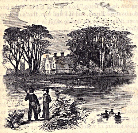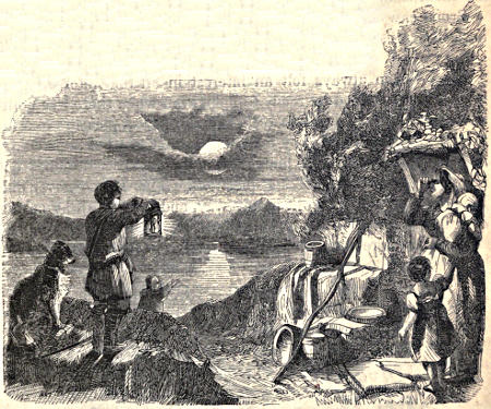 Just at this time the moon began to come out from behind the clouds, and its light was reflected beautifully on the waters of the lake, and the old man obtained, as he thought, a glimpse of a dark object gliding slowly along over the surface of the distant water.