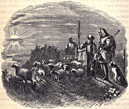 He would stand or sit silently by, looking on and watching what[159] was going forward with great interest, ready to act the moment that he was called upon, as you see in the opposite engraving. They are driving some sheep to pasture very early in the morning. It was dark when they first came out with the flock, and so they brought a lantern; but the sun has risen now, and it is light. Although it was very early when the men set out with the flock, Bruno was eager to come with them. He has helped to drive the sheep all the way. They have reached the pasture at last, and there is now nothing more for him to do. So he is sitting down to rest, and contemplating with great satisfaction, while he rests, the accomplishment of the work which was to be done, and ready to do any thing more that may be required without a moment’s delay.