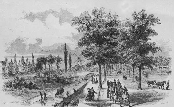 These dikes are so immense, and they are so concealed by the houses, and trees, and mills, and even villages that cover and disguise them, that when the traveller first sees them he can hardly believe that they are dikes. Some of them are several hundred feet wide, and have a good broad public road upon the top, with a canal perhaps by the side of it, and avenues of trees, and road-side[Pg 12] inns, and immense wind mills on the other hand. When riding or walking along upon such a dike on one side, down a long slope, they have a glimpse of water between the trees. On the other, at an equal distance you see a green expanse of country, with gardens, orchards, fields of corn and grain, and scattered farm houses extending far and wide. At first you do not perceive that this beautiful country that you see spreading in every direction on one side of the road is below the level of the water that you see on the other side; but on a careful comparison you find that it is so. When the tide is high the difference is very great, and were it not for the dikes the people would be inundated.[1]