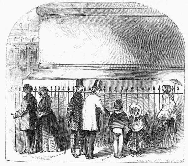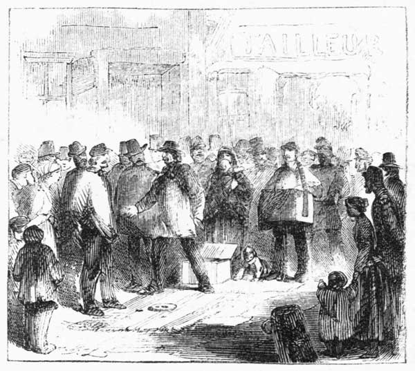 "There was an organ at one end of the ring, with a man playing upon it, to draw the crowd[Pg 220] together. In front of the organ was a woman, with a baby in her arms, and another little child playing about her. The man said that this was his family, and that he had to support them by his experiments. In front of the woman was the box. In front of the box was the man, who stood there, generally, telling what he was going to do, and calling upon the people to throw in their sous. In front of the man was a carpet, on the pavement, and in the middle of the carpet a tin plate. From time to time the people would throw sous over into the circle. The man would then pick them up and put them into the plate, and tell the people how many there lacked. There must be fifteen, he said, or he could not perform the experiment. He kept talking all the time to the people, and saying funny things to make them laugh.