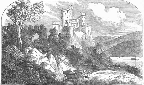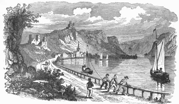 For about one hundred miles of its course, however, near the central portion of it, the river flows through a very wild and mountainous district of country, or rather through a district which was once wild, though now, even in the steepest slopes and declivities, it is cultivated like a garden. The reason why these mountainous regions are so highly cultivated is because the soil and climate are such that they produce the best and most delicious grapes in the world. They have consequently, from time immemorial, been inhabited by a dense population. Every foot of ground where there is room for a vine to grow is valuable, and where the slope was originally steep and rocky, the peasants of former ages have gathered out the rocks and stones, and built walls of them to terrace up the land. The villages of these peasants, too, are seen every where nestling in the valleys, and clinging to the sides of the hills, while the summits of almost all[Pg 17] the elevations are crowned with the ruins of old feudal castles built by barons, or chiefs, or kings, or military bishops of ancient times, famous in history. This picturesque portion of the river, which extends from Bonn, a little above Cologne, to Mayence,—which towns you will readily find on almost any map of Europe,—was the part which Mr. George and Rollo particularly desired to see. When they left Switzerland they intended to come down the river, and see the scenery in descending. But Mr. George met some friends of his on the frontier, who persuaded him to make a short tour with them in Germany, and so come to the Rhine at Cologne.